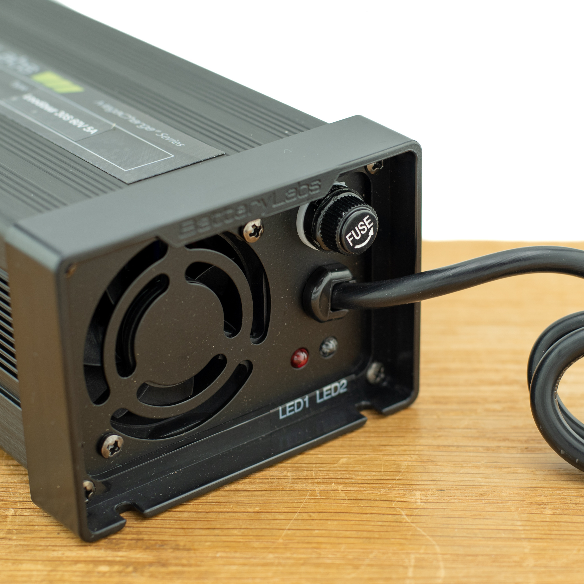 De koeling van deze 60V acculader gebeurt via een mechanische ventilator/ fan.
