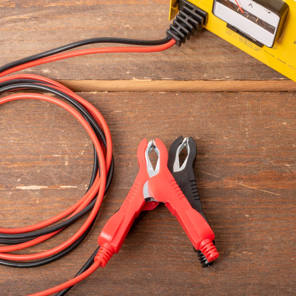Deze acculader heeft een geïntegreerde opbergruimte voor de kabels en klemmen.