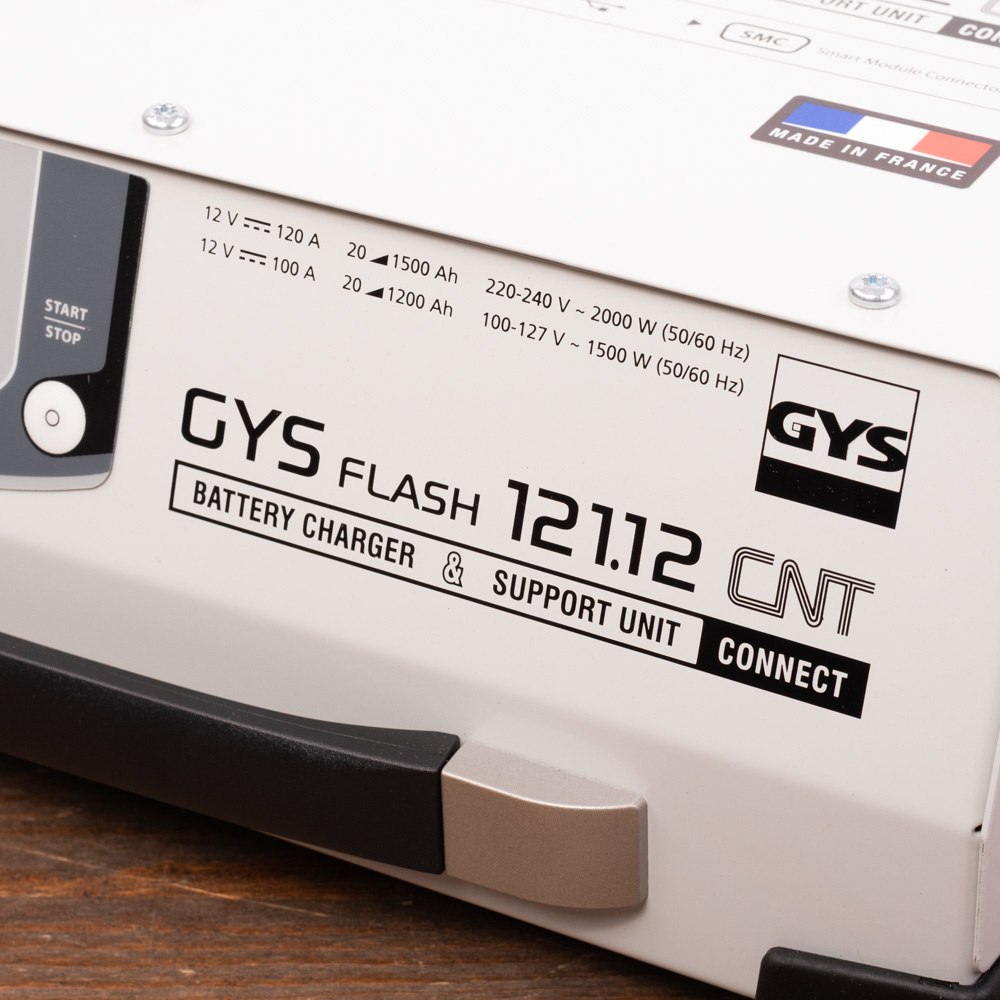 De GYSFLASH 121.12 CNT FV - waarbij CNT staat voor Connected en FV voor Flexibel Voltage - is een krachtige, veelzijdige max. 120A acculader (1500/2000W, afhankelijk van het AC voedingsvoltage 100-127V of 220-240V) met Inverter technologie. Het is een acculader voor 12V loodaccu's (vloeibaar/AGM/Gel) en LiFePO4 accu's van 5-1500Ah.
