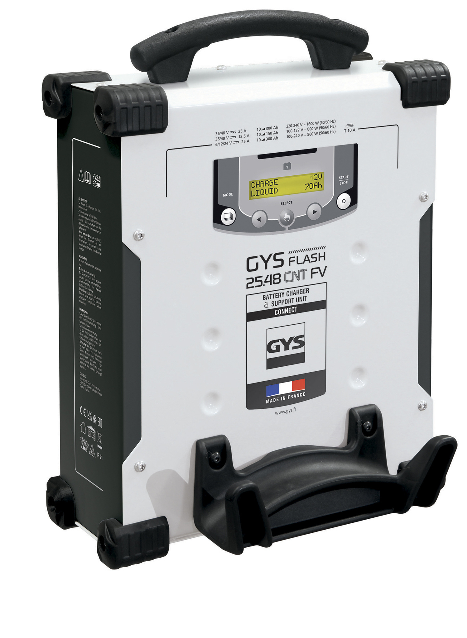 De GYSFLASH 25.48 CNT FV - waarbij CNT staat voor Connected en FV voor Flexibel Voltage - is een krachtige, veelzijdige acculader met Inverter technologie. Het is een acculader voor 6V, 12V, 16V, 24V, 36V en 48V loodaccu's (vloeibaar/AGM/Gel) en Lithium (Lithium-ion en LiFePO4) accu's van 10-300Ah.