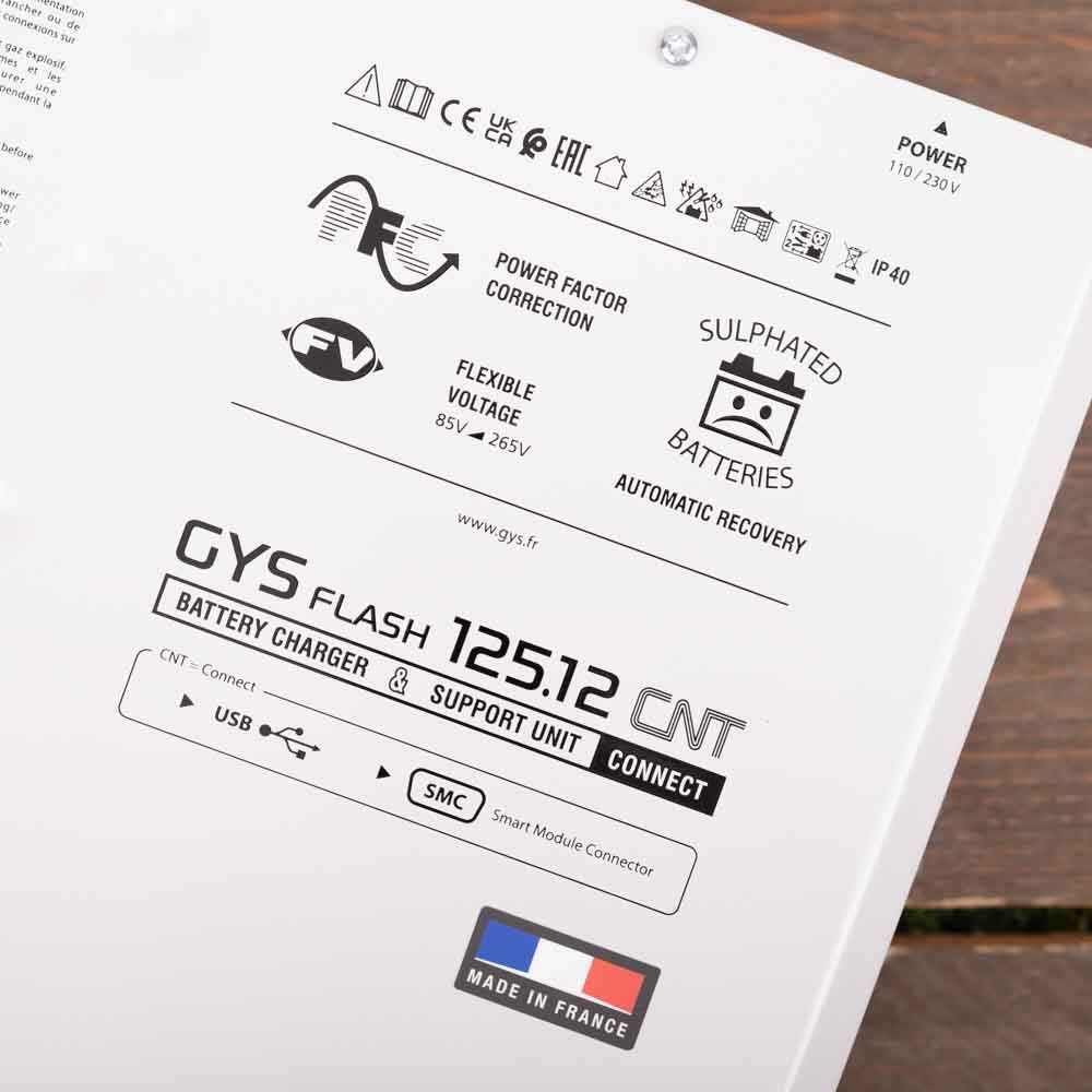 De GYSFLASH 125.12 CNT FV - waarbij CNT staat voor Connected en FV voor Flexibel Voltage - is een krachtige, veelzijdige max. 120A acculader (1500/2000W, afhankelijk van het AC voedingsvoltage 100-127V of 220-240V) met Inverter technologie. Het is een acculader voor 12V loodaccu's (vloeibaar/AGM/Gel) en LiFePO4 accu's van 20-1500Ah.
