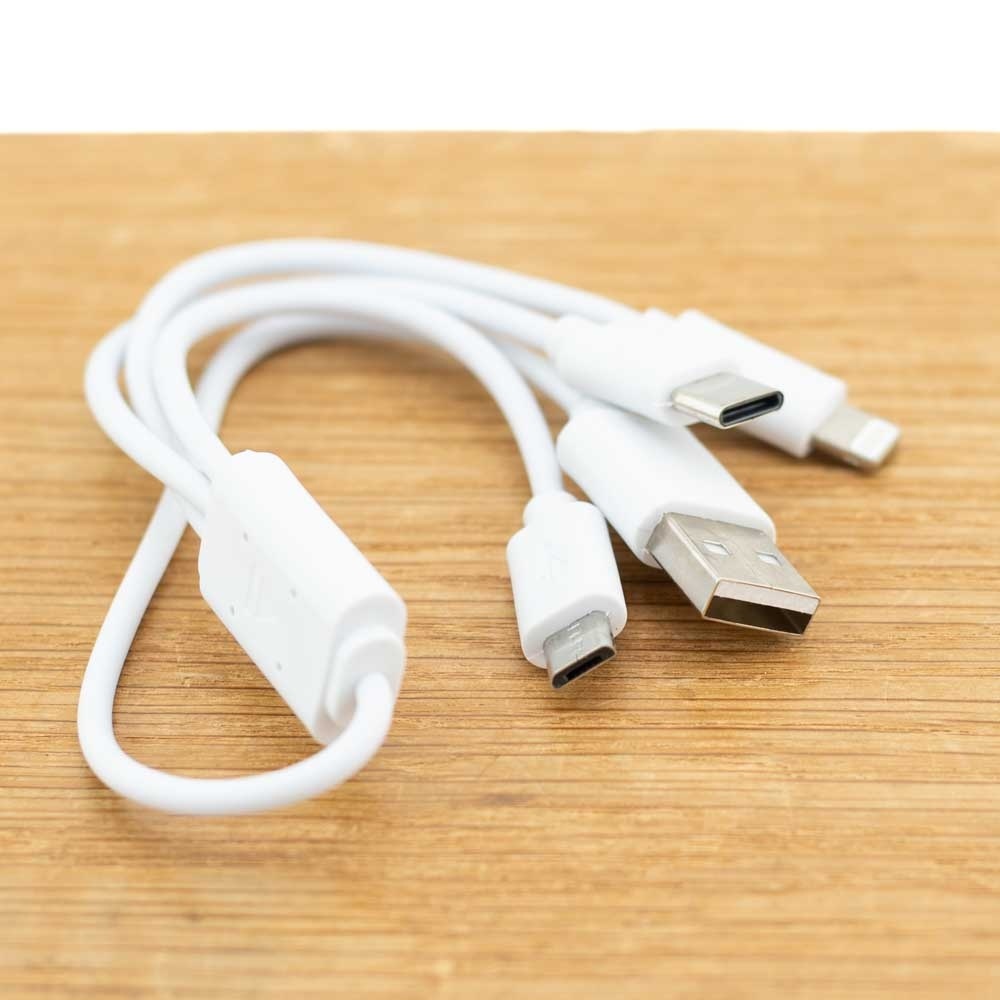 De meegeleverde USB kabels zijn een USB-C, Micro USB en Lightning.