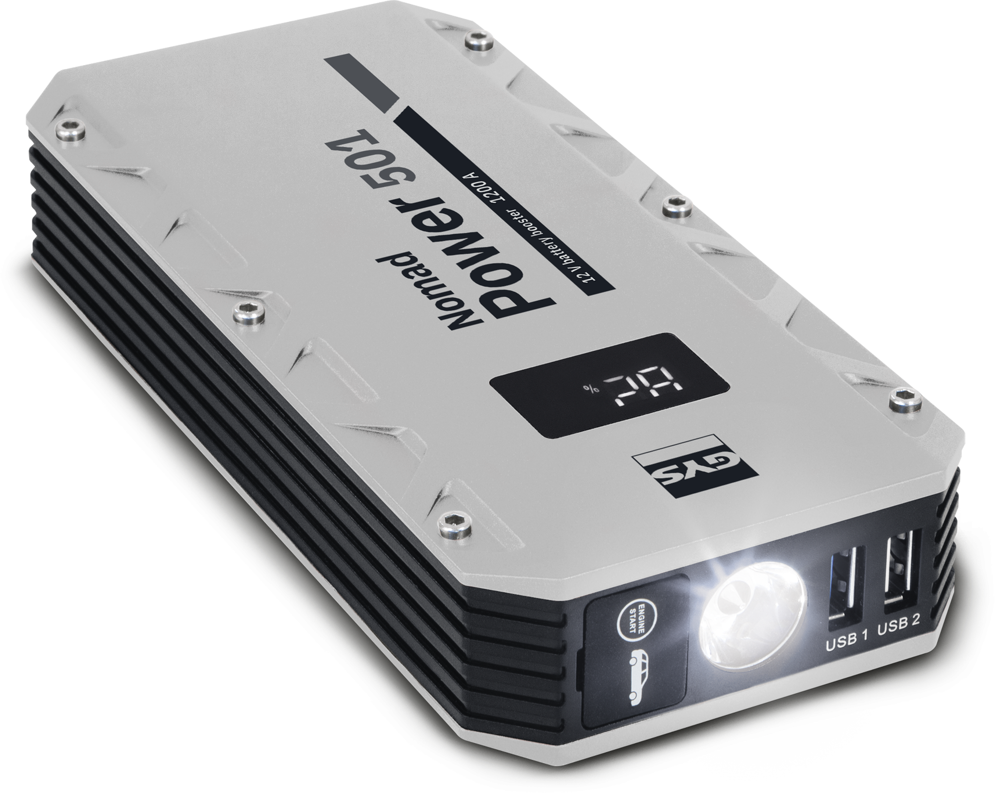 De GYS Nomad Power 501 is een compacte, handige starthulp en powerbank in een. U kunt telefoons, iPads, fototoestellen en laptops opladen. U kunt er zelfs een voertuig zoals een motorfiets, een scooter of een kleine auto (kleine benzine motoren) starten. De startboost voor 12V systemen is 500A.