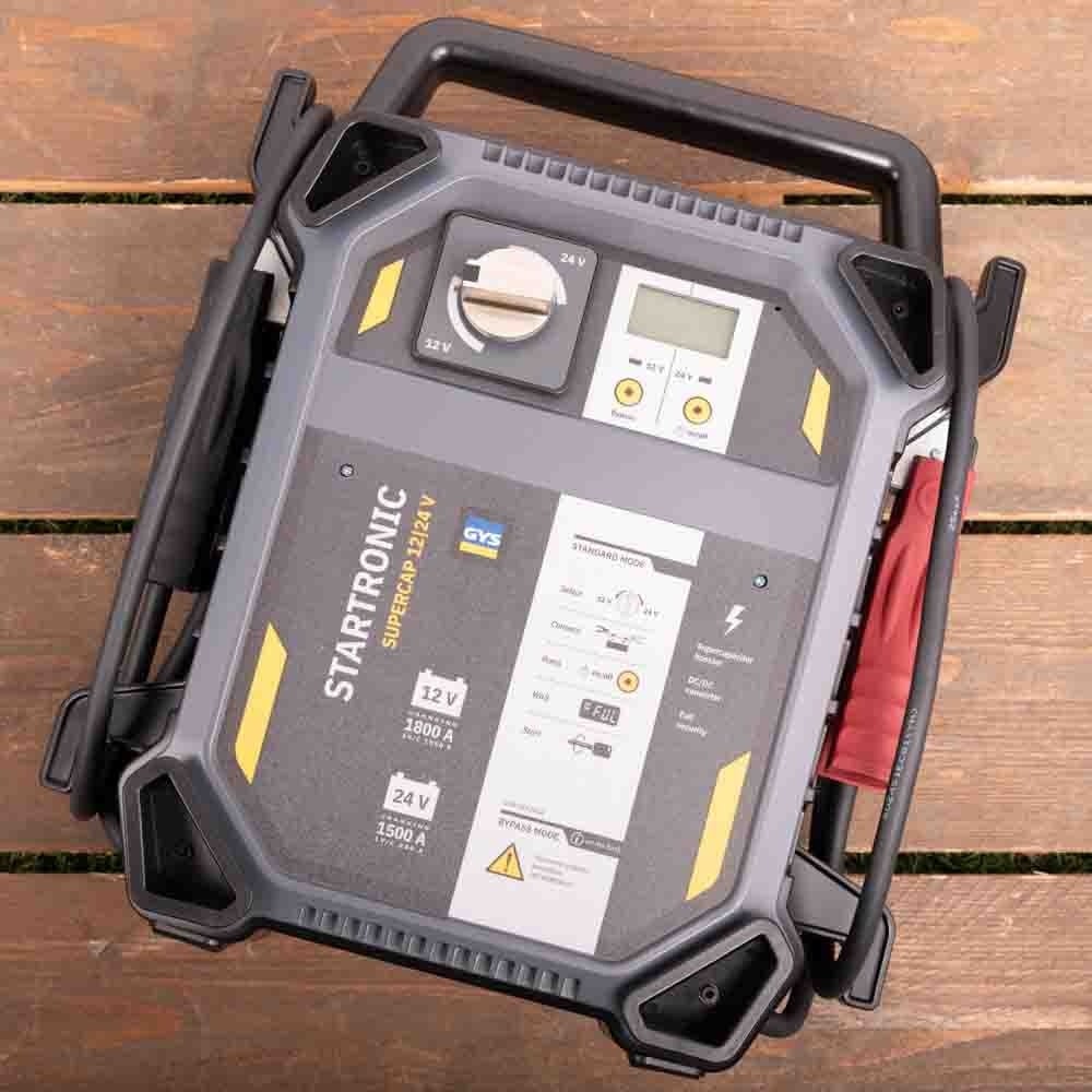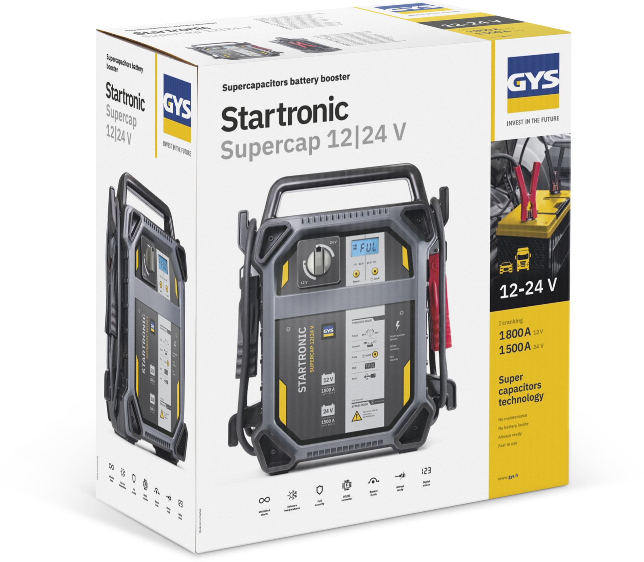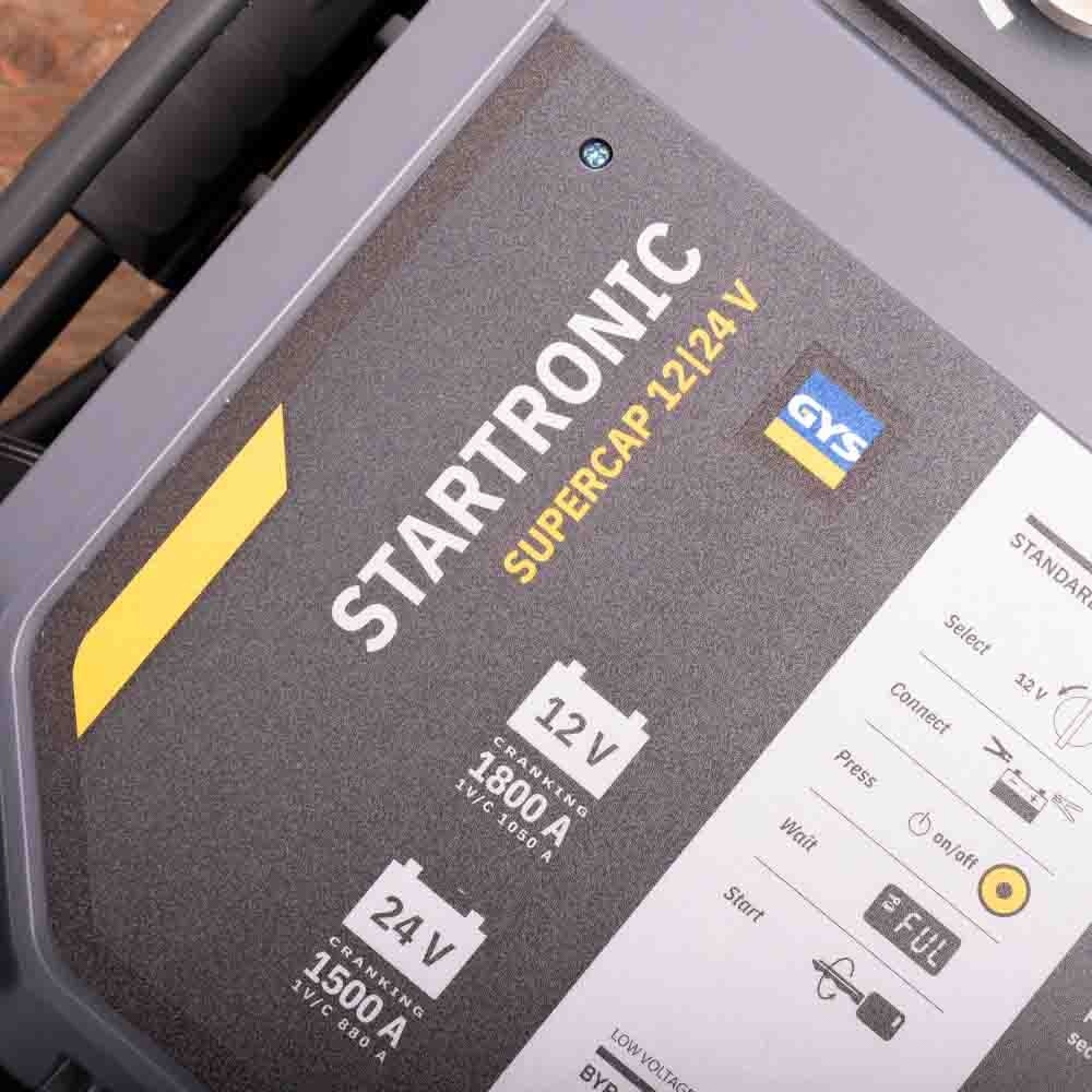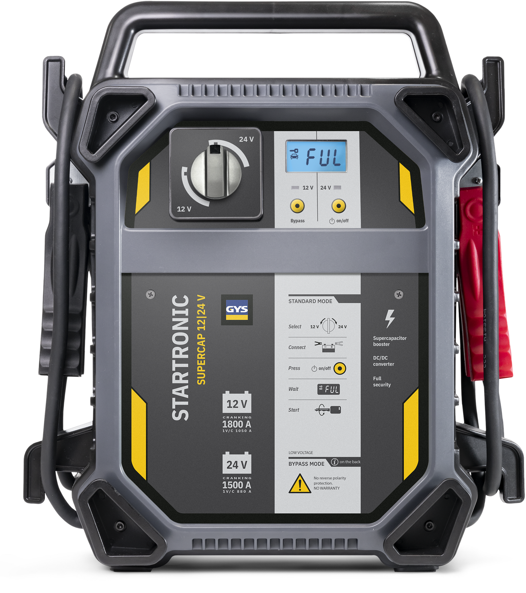 De slimme en krachtige Startronic Supercap van GYS is een startbooster zonder interne accu. Dankzij supercondensatoren kunt u een voertuig met (bijna) lege 12V of 24V startaccu probleemloos starten, ook bij winterse kou. Het startvermogen voor een 12V systeem bedraagt 1.800A en voor een 24V systeem 1.500A.