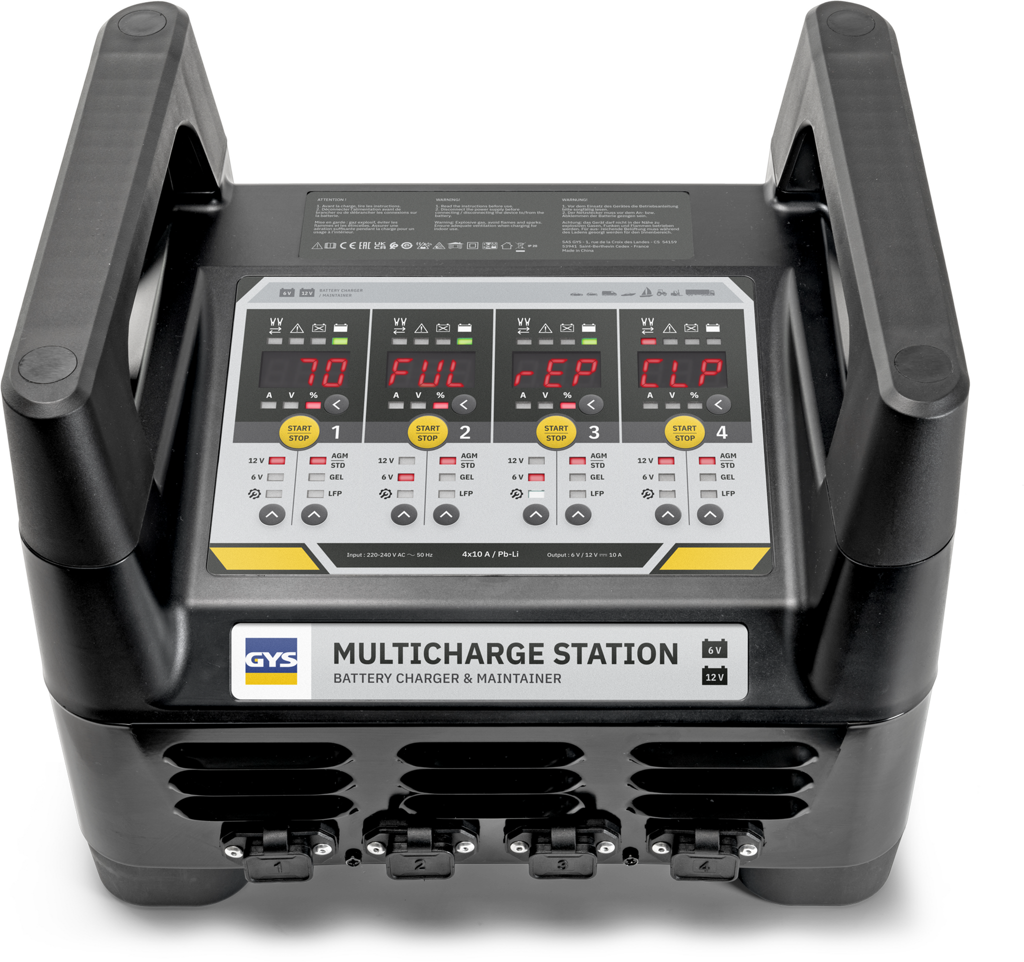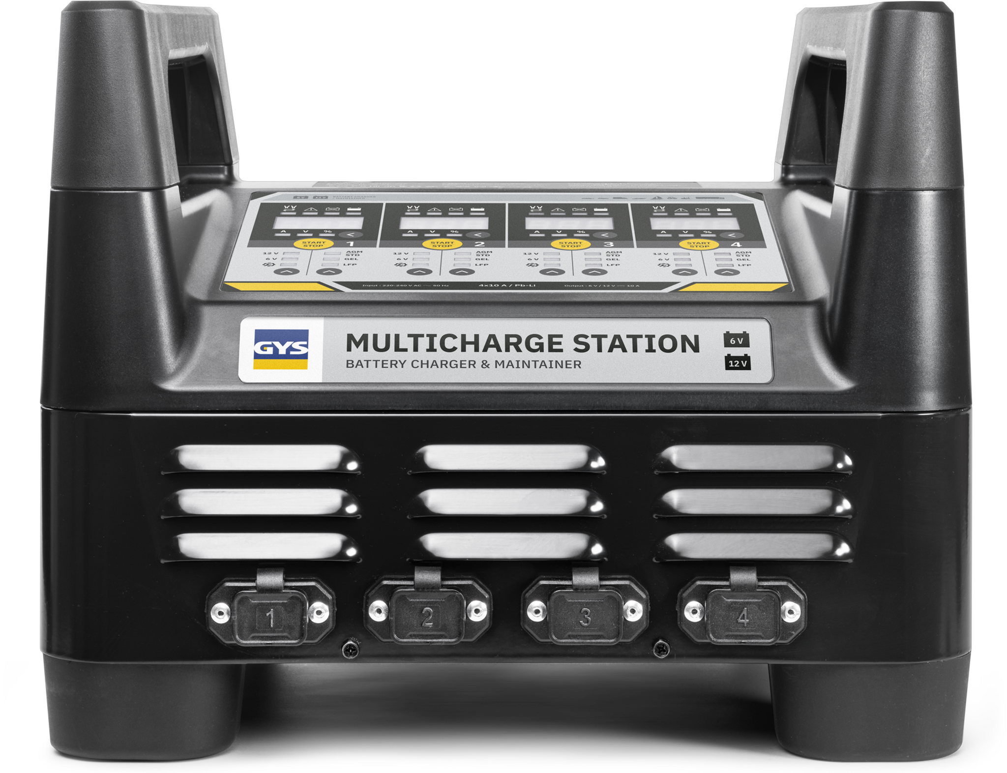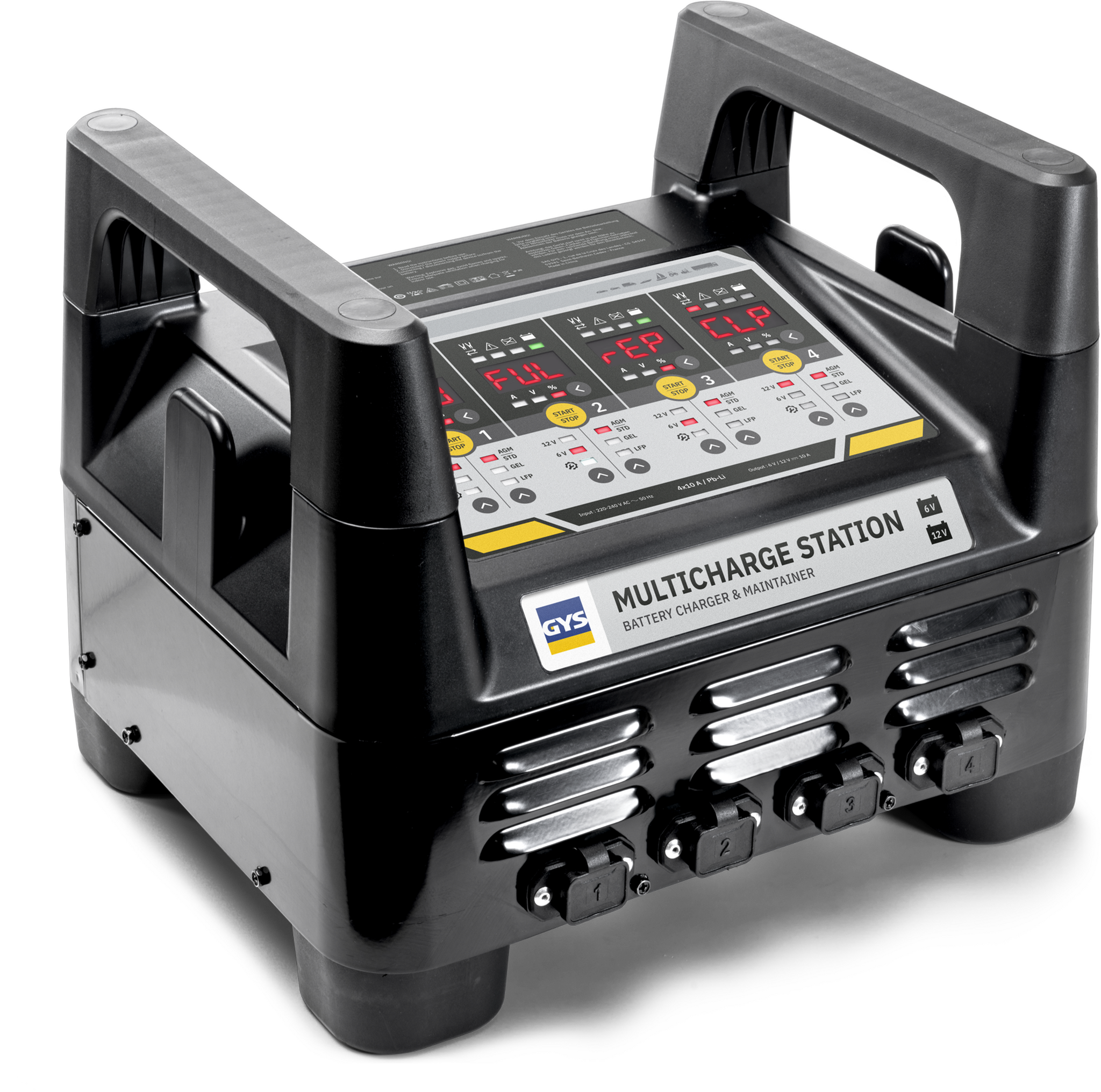 De GYS Multicharge station 4x10A is een krachtig laadstation voor maximaal vier 6V of 12V accu's. GYS Multicharge is geschikt voor zowel loodzuur accu's als voor LiFePo4 accu's. De GYS Multicharge 4x10A is geschikt voor alle soorten loodzuur accu’s (standaard, AGM en Gel) met een spanning van 6V of 12V en met een capaciteit van 8 tot 250 Ah. Verder laadt de Multicharge ook 6V en 12V Lithium (LiFePO4) accu’s op met een capaciteit van 8 tot 250 Ah.