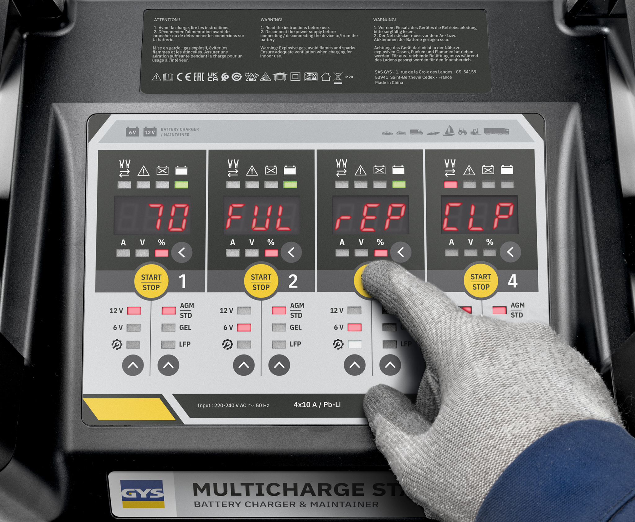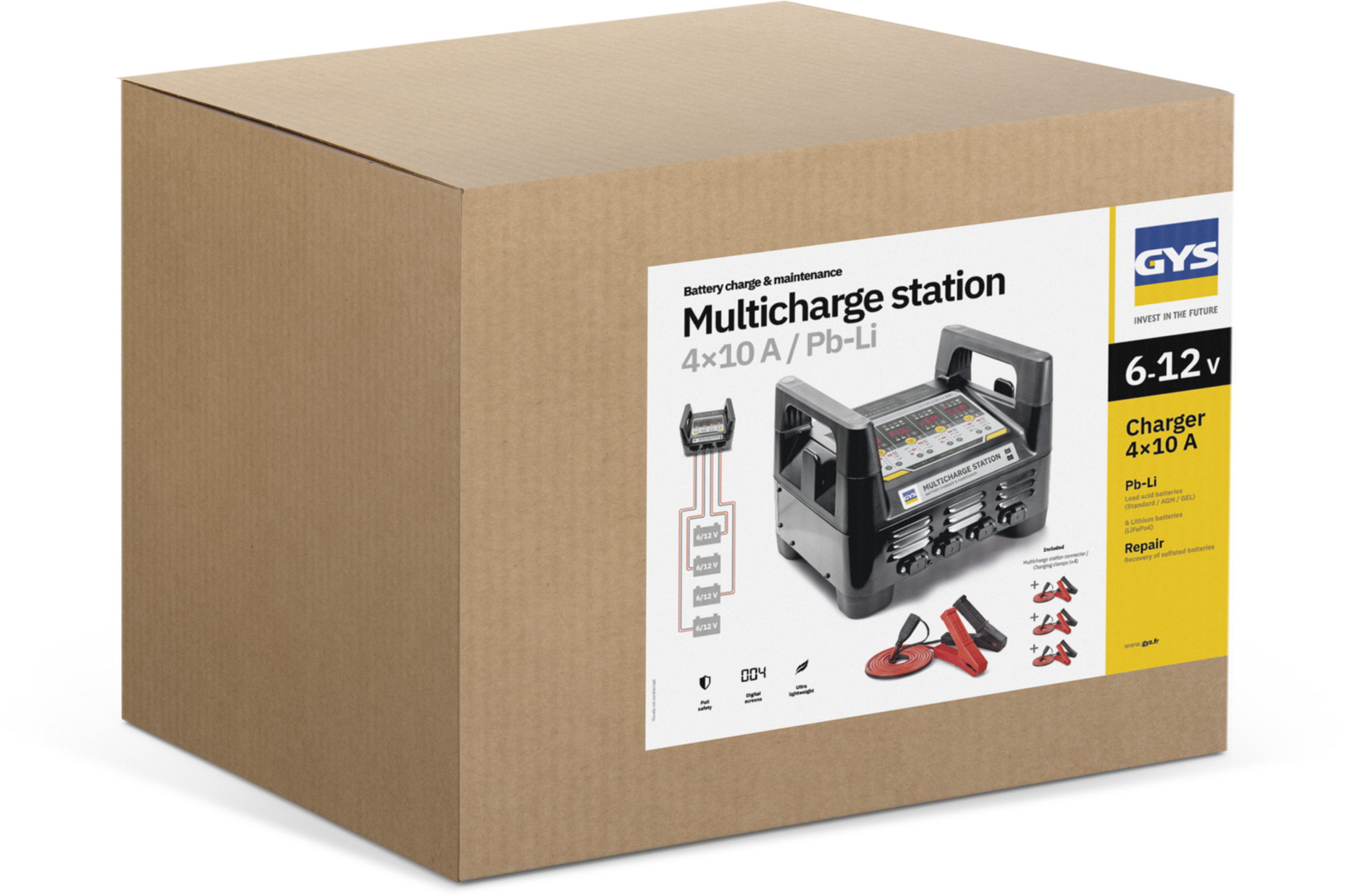 De GYS Multicharge 4x10A is geschikt voor alle soorten loodzuur en lithium accu’s (standaard, AGM, Gel en LiFePO4) met een spanning van 6V of 12V en met een capaciteit van 8 tot 250 Ah.
