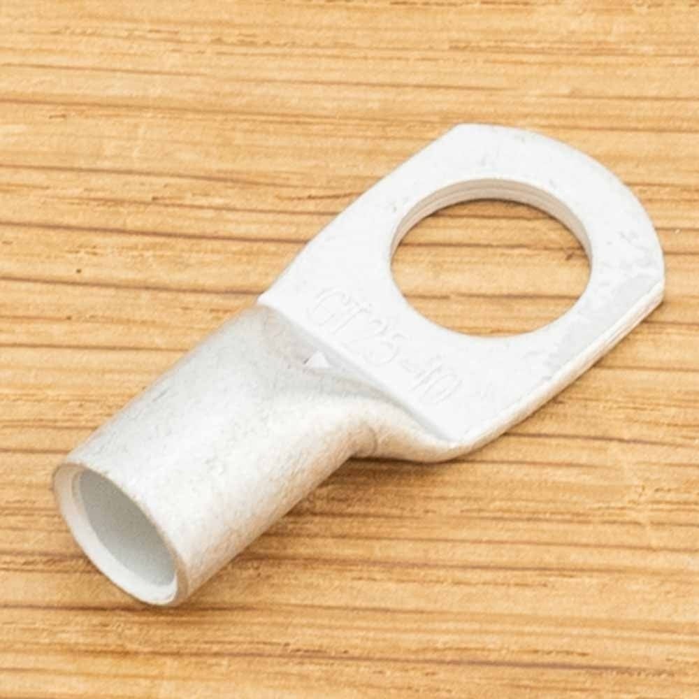 Dit ongeïsoleerde perskabeloog is geschikt voor een kabeldiameter van 25mm² en heeft een aansluitoog voor M10 bouten (de diameter van het gat is 10,5mm). U kunt de aansluiting isoleren met krimpkous. Zie hiervoor de gerelateerde producten onder de productomschrijving.