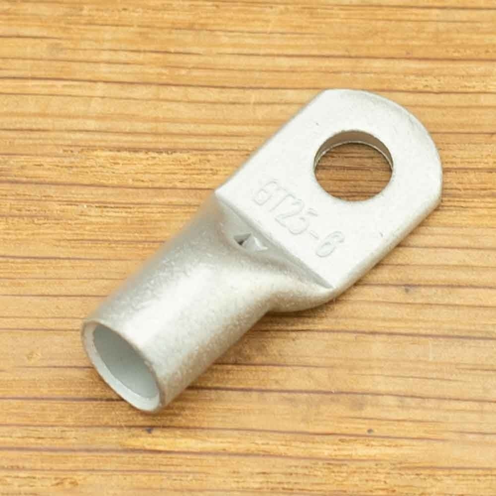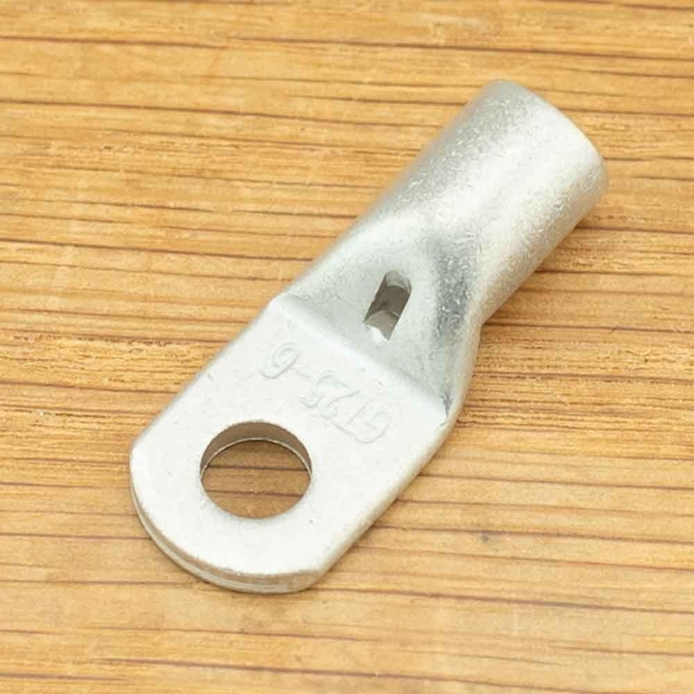 Dit ongeïsoleerde perskabeloog is geschikt voor een kabeldiameter van 25mm² en heeft een aansluitoog voor M6 bouten (de diameter van het gat is 6,4mm). U kunt de aansluiting isoleren met krimpkous. Zie hiervoor de gerelateerde producten onder de productomschrijving.