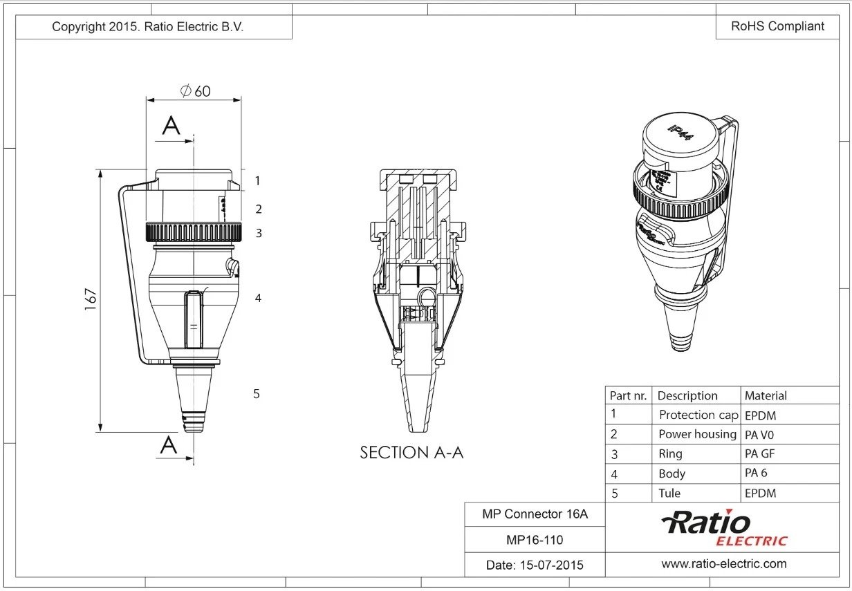 Deze Ratio Walstroom stekker van 16A is bedoeld om aan de zijde van het voertuig of vaartuig een aansluiting te kunnen maken met de walstroom inlet van het voertuig of vaartuig. De stekker wordt geschroefd op de kabel.