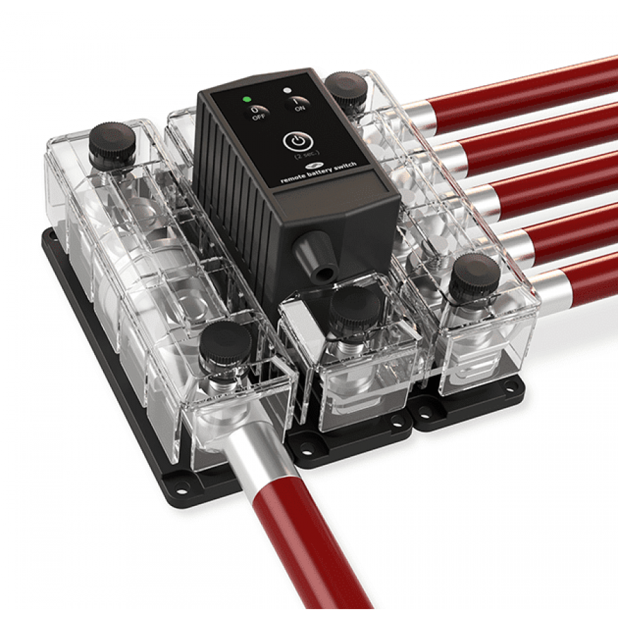 Noot: het is niet mogelijk om de Remote Battery Switch af- of in te schakelen op een zelf ingestelde spanning. Voor die extra mogelijkheid verwijzen we naar de Battery Protect Relay (24V/500A). Deze laatste biedt namelijk bescherming tegen diep ontladen, en bovendien een overbruggingsmodus.