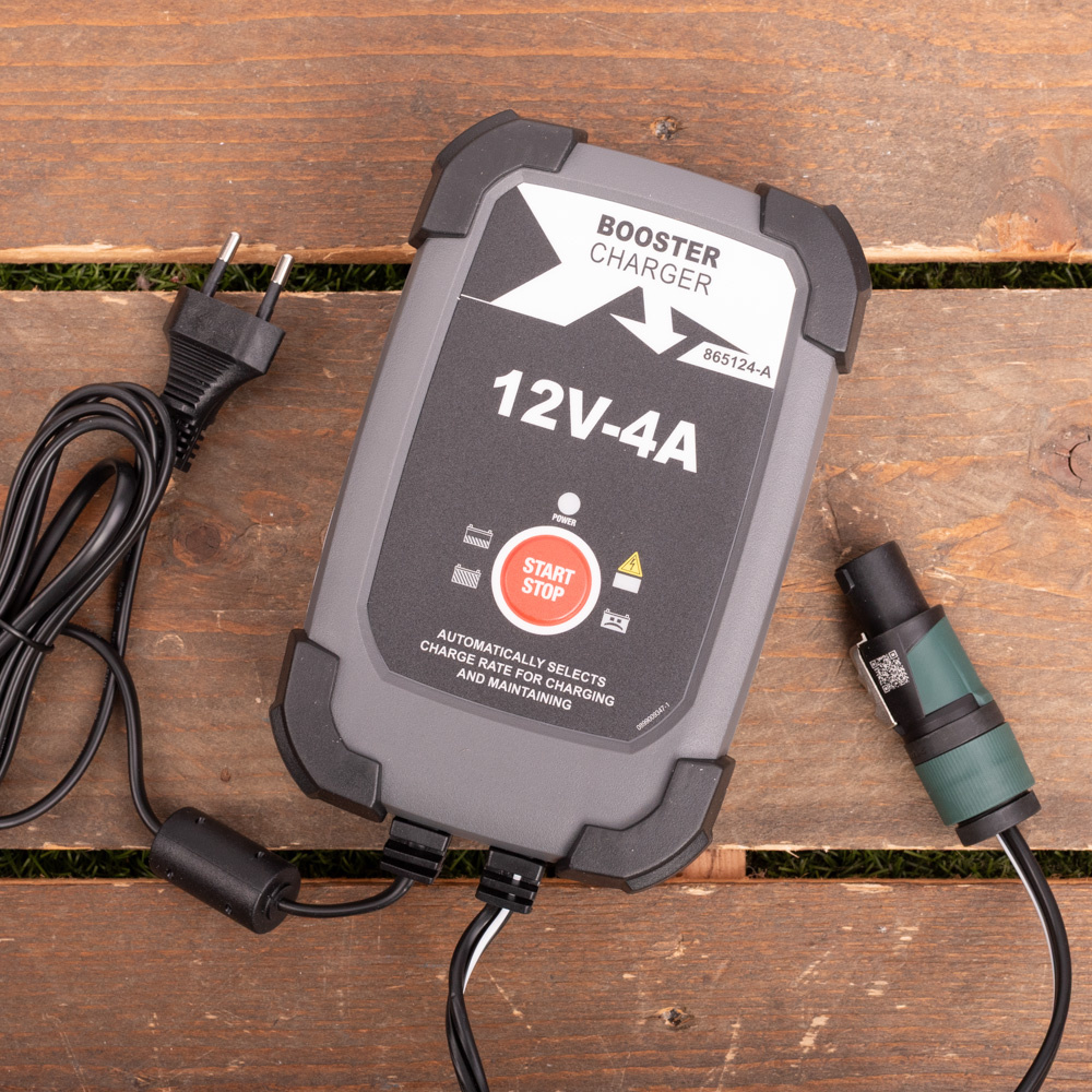 Het opladen van de Schumacher Booster kan via de meegeleverde 4A acculader (AC/DC 230V stopcontact).