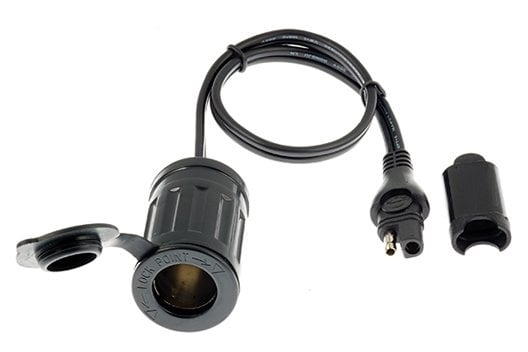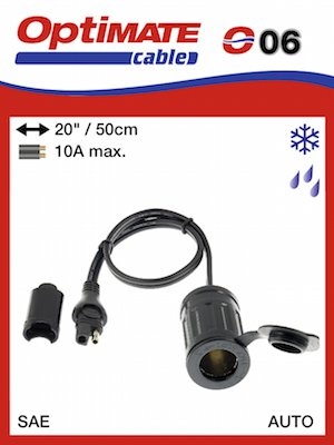 Deze kabel O6 (ook O06, O-06 of O-6 genoemd) heeft aan een uiteinde van de kabel een SAE aansluiting en aan de andere kant een auto-ingang van 21 mm Ø (sigarettenaansteker ingang). U kunt deze kabel gebruiken voor accessoires zoals bijvoorbeeld een USB-lader of gps-adapter met autostekker.