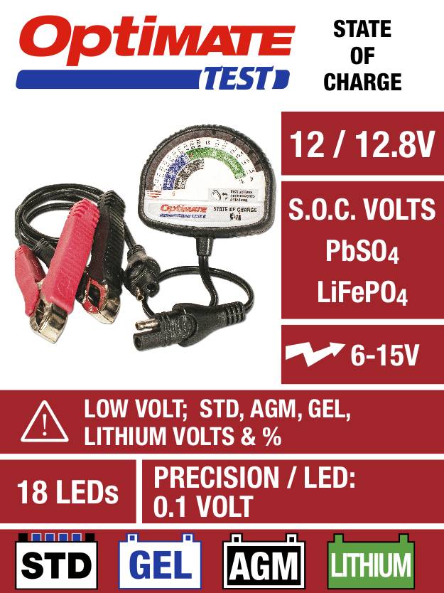 De Optimate TEST TS126 accutester is bedoeld om de laadtoestand vast te stellen van uw accu. Hij kan gebruikt worden voor alle loodzuur- en LiFePO4 / LFP Lithiumaccu’s.
