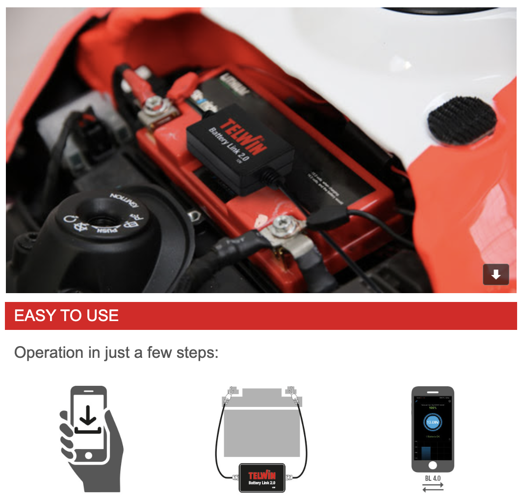 De Telwin Battery Link is een draadloos (bluetooth) accu monitoring systeem. Battery Link toont statistieken over de conditie van de accu en monitort tevens de dynamo. De Telwin Battery Link werkt op 12V loodzuur accu's.