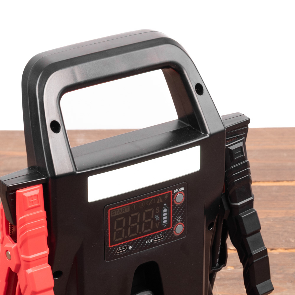 Voor gebruik in donkere omstandigheden is de booster uitgerust met een krachtige tweekleurige LED-lamp. Deze lamp beschikt over meerdere standen, waaronder continu licht, stroboscoop en een SOS-signaalfunctie. Hierdoor kan de lamp ook dienen als noodverlichting bij pech of werkzaamheden langs de weg.