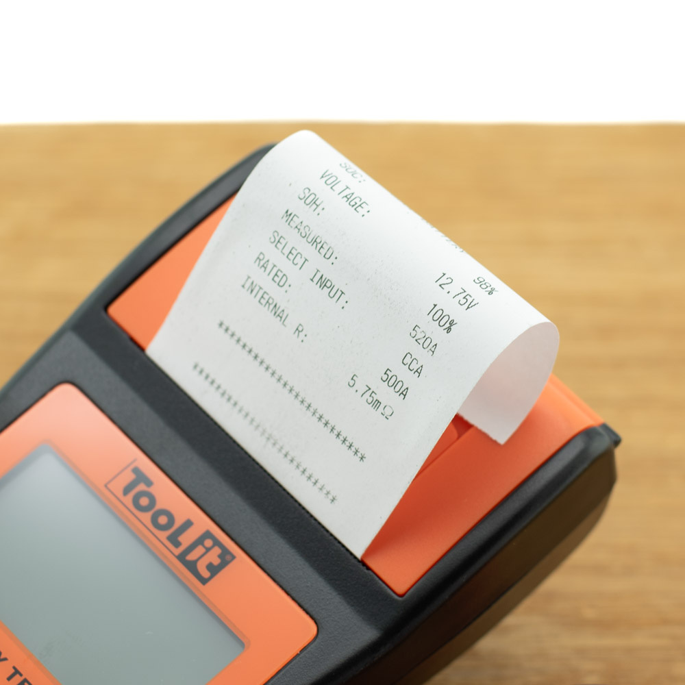 Met de thermische printer kunt u de tijdens de test verzamelde gegevens (accu test en/of start test en/of laadsysteem test) printen, met datum en tijd. Vanzelfsprekend is een nieuw rolletje papier eenvoudig te plaatsen in het betreffende compartiment. Zie ook de Gerelateerde producten voor het papier dat in deze accutester past. U ontvangt bij deze tester alvast twee extra rolletjes printpapier. Uiteraard zijn de testresultaten ook af te lezen zonder deze te printen. Bovendien is het mogelijk de testresultaten te exporteren; met behulp van de Data Line kunt u deze aansluiten op een computer.