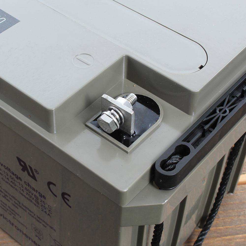 De aansluitingen op de accu zijn van koper met gaten voor M6 bouten. Dit zorgt voor een goed contact met de accukabels en daarmee de aangesloten apparatuur. Met M6 bouten kunnen perskabelogen/ buiskabelschoenen direct op de accu worden aangesloten. Montage van aparte accupolen is daarmee overbodig. De accu's voldoen aan zowel de Europese CE- als ook de Amerikaanse UL-specificaties in brandbestendige ABS-behuizingen. Alle Victron AGM accu’s worden geleverd met wereldwijde 2 jaar garantie van Victron Energy.