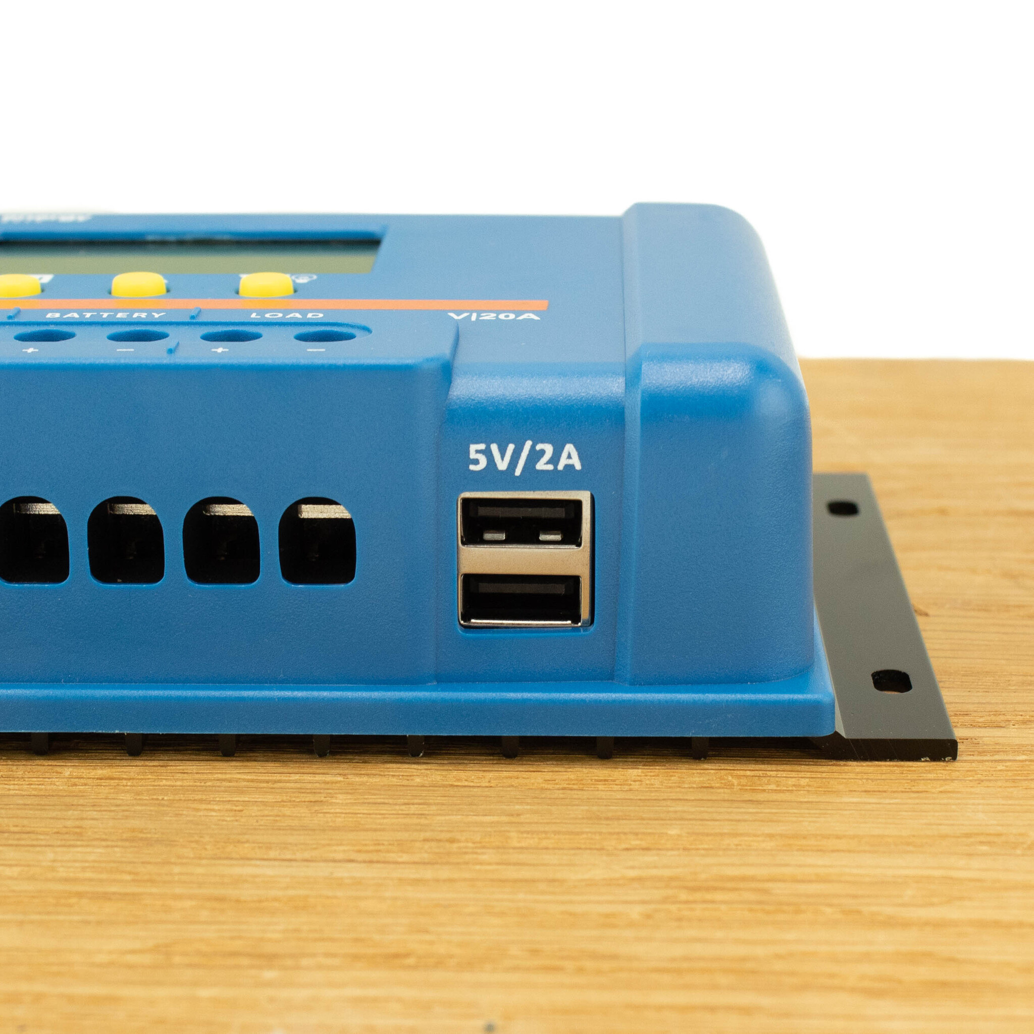 De Victron BlueSolar PWM LCD - USB bevat 2 5V USB poorten met een maximaal laadvermogen van 2A waarmee u USB apparaten kunt aansluiten en laden.