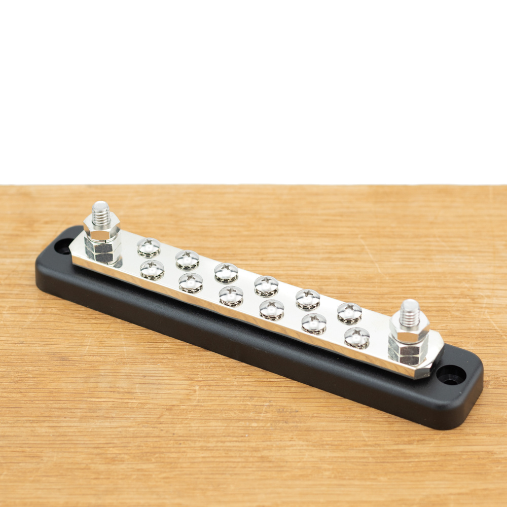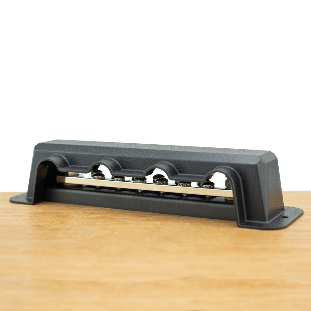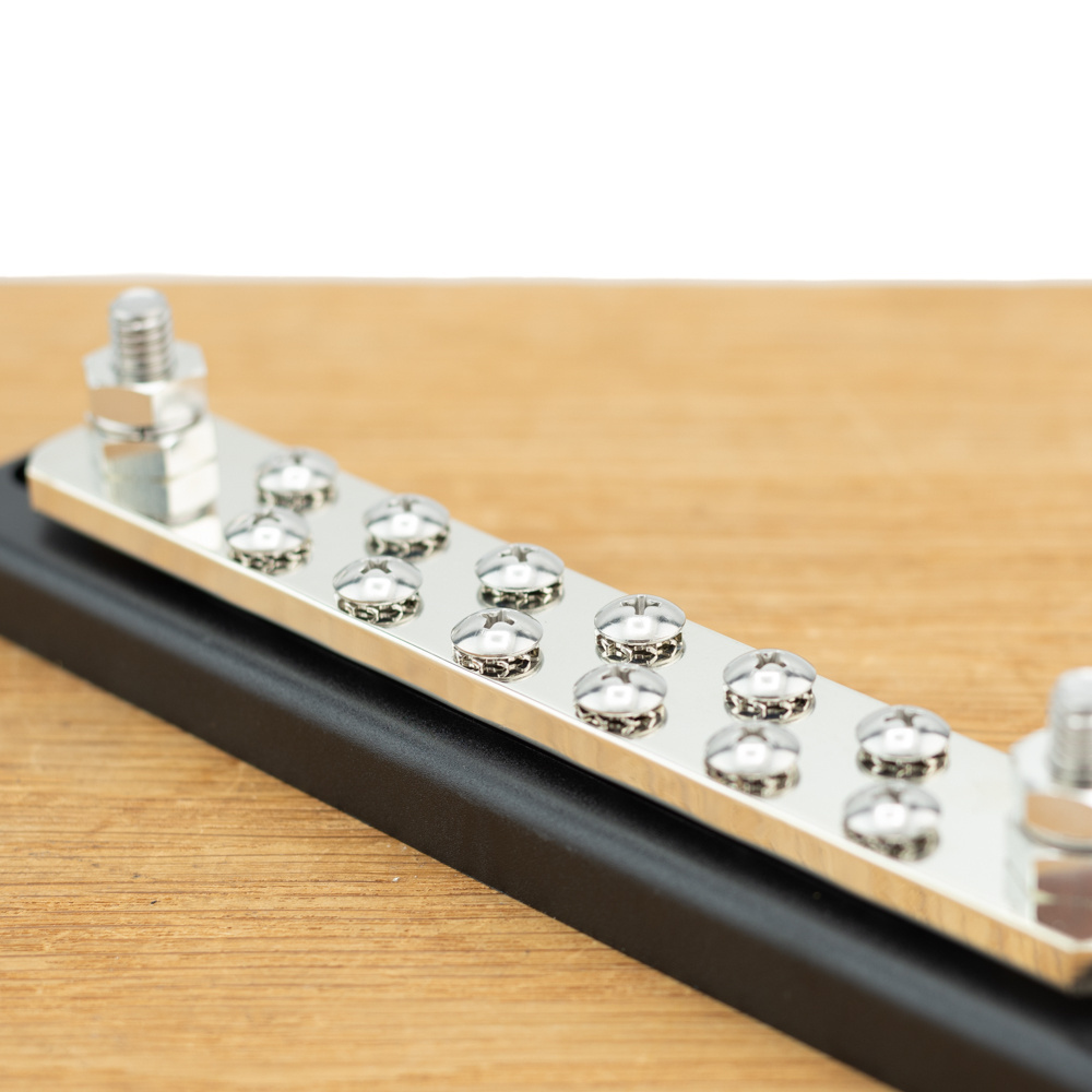 Deze DC Verdeelrail heeft 2 keer een M6 en 12 keer een M4 draadeind. Perskabelogen of eyelets/ ringogen sluit u hiermee eenvoudig naast elkaar aan. De verdeelrail wordt geleverd met een zwarte afdekkap (niet afgebeeld op de foto), zodat de aansluitingen netjes afgedekt zijn.