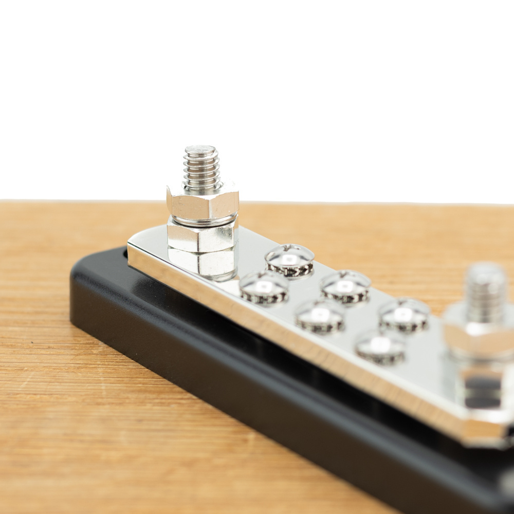 Deze DC Verdeelrail heeft 2 keer een M6 en 6 keer een M4 draadeind. Perskabelogen of eyelets/ ringogen sluit u hiermee eenvoudig naast elkaar aan. De verdeelrail wordt geleverd met een zwarte afdekkap (niet afgebeeld op de foto), zodat de aansluitingen netjes afgedekt zijn.