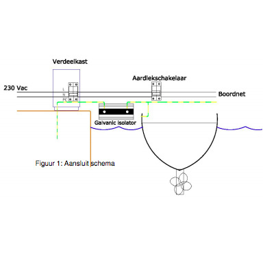 Hanteer bij de installatie van de galvanische isolator de gebruiksaanwijzing die meegeleverd wordt met het product. De galvanische isolator dient in de groen/gele aardraad verbinding gemonteerd te worden, vóór de aardverbinding naar het schip. Zie foto 2 voor een schematisch overzicht van de plaatsing van de galvanische isolator.