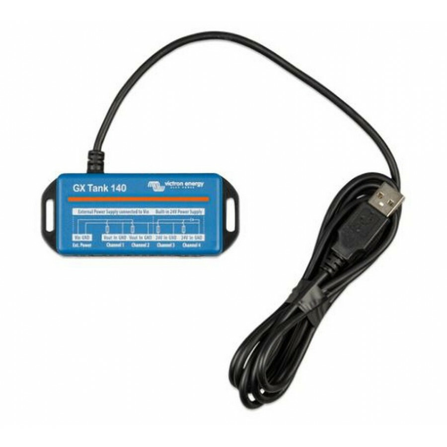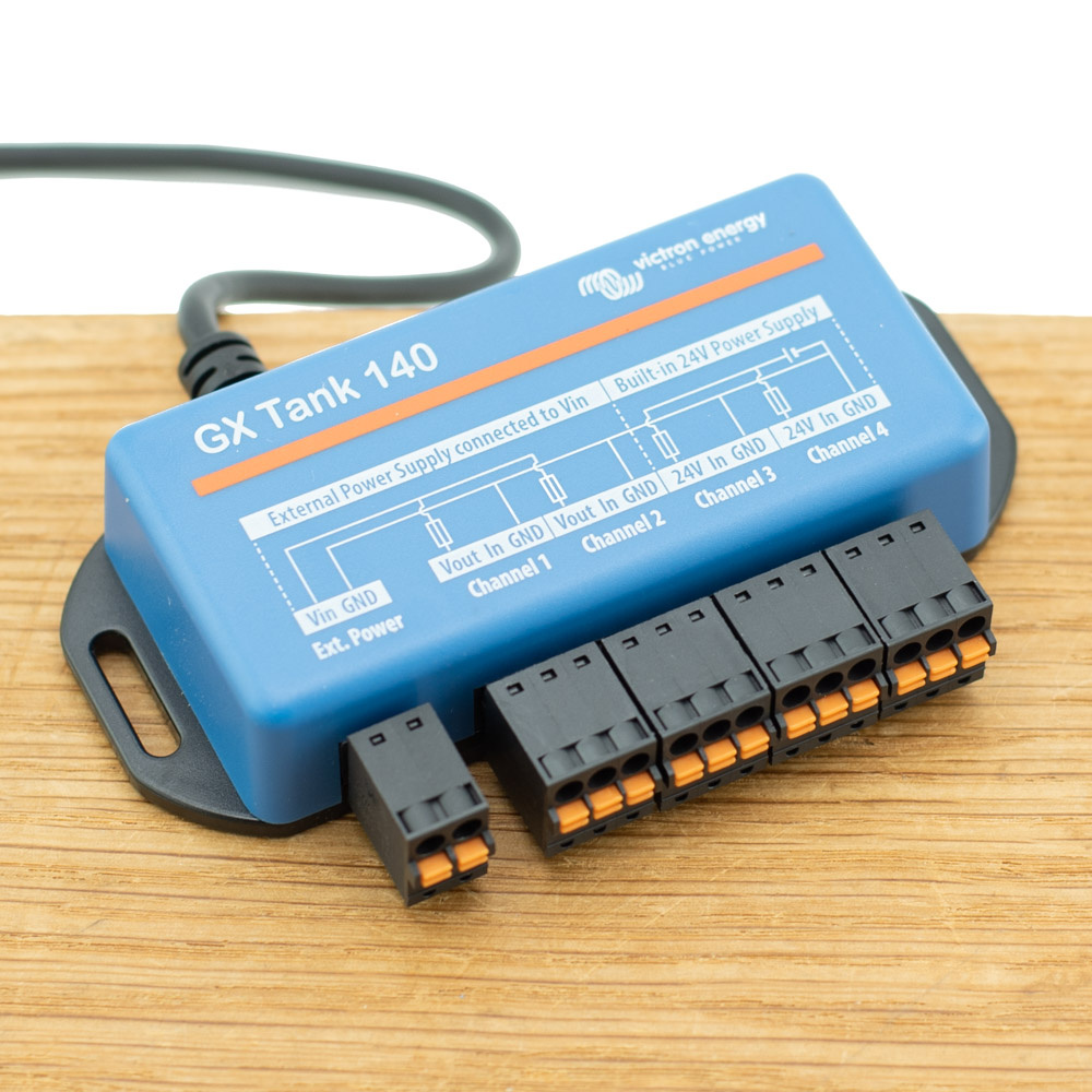 De aansluiting op het GX-apparaat is via USB (Dit is ook hoe de GX Tank 140 voeding krijgt. Er zijn dus geen extra voedingskabels nodig). De bedrading van de tanksensor is zo simpel als mogelijk gehouden: twee van de vier ingangen leveren een 24 V-voedingsbron om de sensor te voeden. De andere twee kanalen hebben wel een externe voedingsbron nodig. Daarvoor is een voedingingangsklem samen met gezekerde uitgangen voorzien. Het hoge en lage limiet is configureerbaar, zodat ook sensoren gebruikt kunnen worden die slechts een gedeelte van de schaal gebruiken, bijvoorbeeld 0 tot 5 V. Om een stabiele aflezing te krijgen kunnen de metingen gedempt worden. Het dempen kan worden geconfigureerd tussen 1 en 60 seconden.