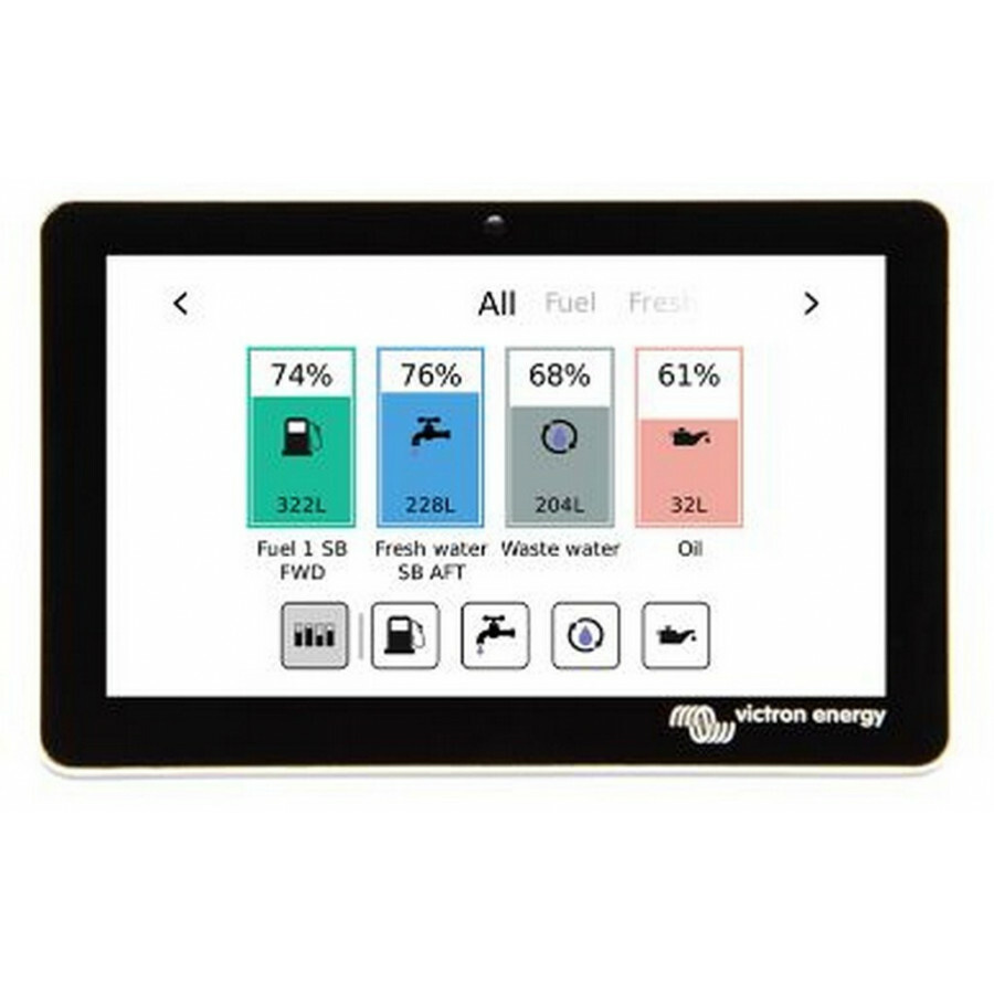 Op de derde foto is een voorbeeld te zien van hoe de tanklevels getoond worden op een Victron GX Touch 50 scherm (dit scherm wordt niet meegeleverd bij dit product).