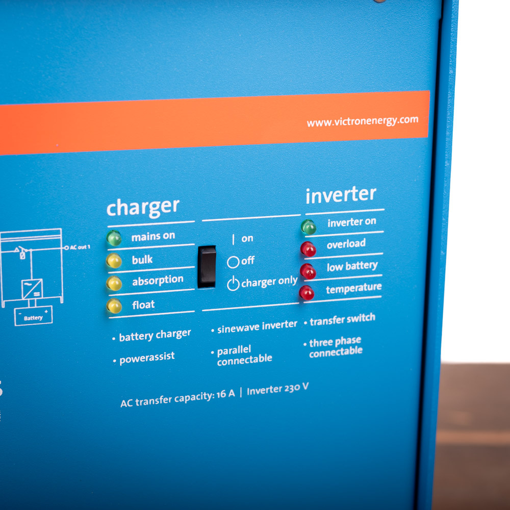 De Victron MultiPlus 12/3000/120-16 is een combinatie van een krachtige pure sinusomvormer en een geavanceerde acculader. De MultiPlus 12/3000/120-16 beschikt over slimme laadtechnologie en een snelle AC-schakelaar. De lader is geschikt voor alle soorten accu's inclusief lithium. Standaard is de MultiPlus ingesteld op Gel, AGM accu's en natte accu's met instelbare voltages via DIP-schakelaars. Via VEconfiguratie kunnen ook lithium of andere soorten accu's geconfigureerd worden.