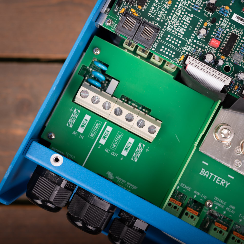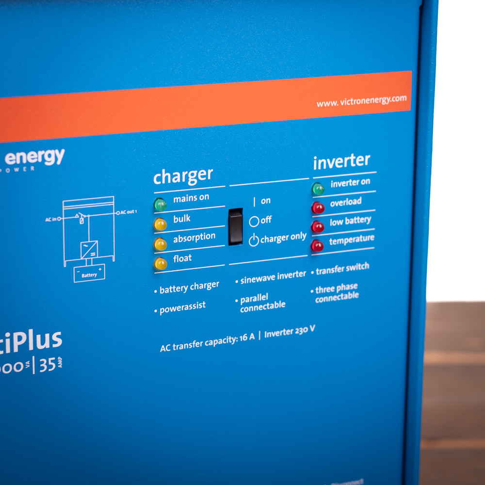 De Victron MultiPlus wordt geleverd zonder de benodigde kabels. U kunt hiervoor 35 mm² kabels gebruiken (35 mm² rode accukabel/ laskabel en 35 mm² zwarte accukabel/ laskabel) bij een afstand tot de accu van maximaal 5 meter. Bij langere afstand tot de accu dan 5 meter wordt geadviseerd 2 x 35 mm² kabels te gebruiken. Bekabeling kunt u ook vinden via de links onderaan de tekst bij dit product. De stekkers voor de in- en uitgang op de Multiplus voor 230V worden wel meegeleverd.
