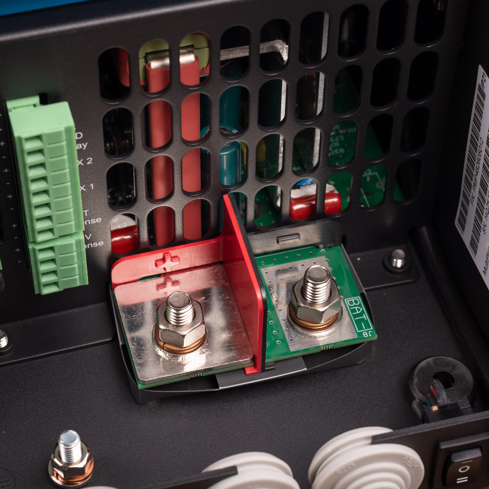 De Victron MultiPlus-II wordt geleverd zonder de benodigde kabels. U kunt hiervoor 70 mm² kabels gebruiken (70 mm² rode accukabel/ laskabel en 70 mm² zwarte accukabel/ laskabel) bij een afstand tot de accu van maximaal 5 meter. Bij langere afstand tot de accu dan 5 meter wordt geadviseerd 2 x 70 mm² kabels te gebruiken. Bekabeling kunt u ook vinden via de links onderaan de tekst bij dit product. De stekkers voor de in- en uitgang op de Multiplus voor 230V worden wel meegeleverd.