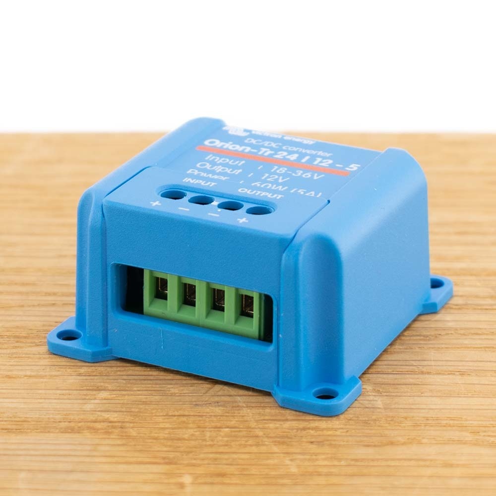 Met de Victron Orion-Tr DC-DC omvormer kunt u een 12 Volt apparaat aansluiten/ gebruiken in een 24V-systeem. Deze omvormer geeft daarbij een vermogen van 60W en 5A aan stroom.