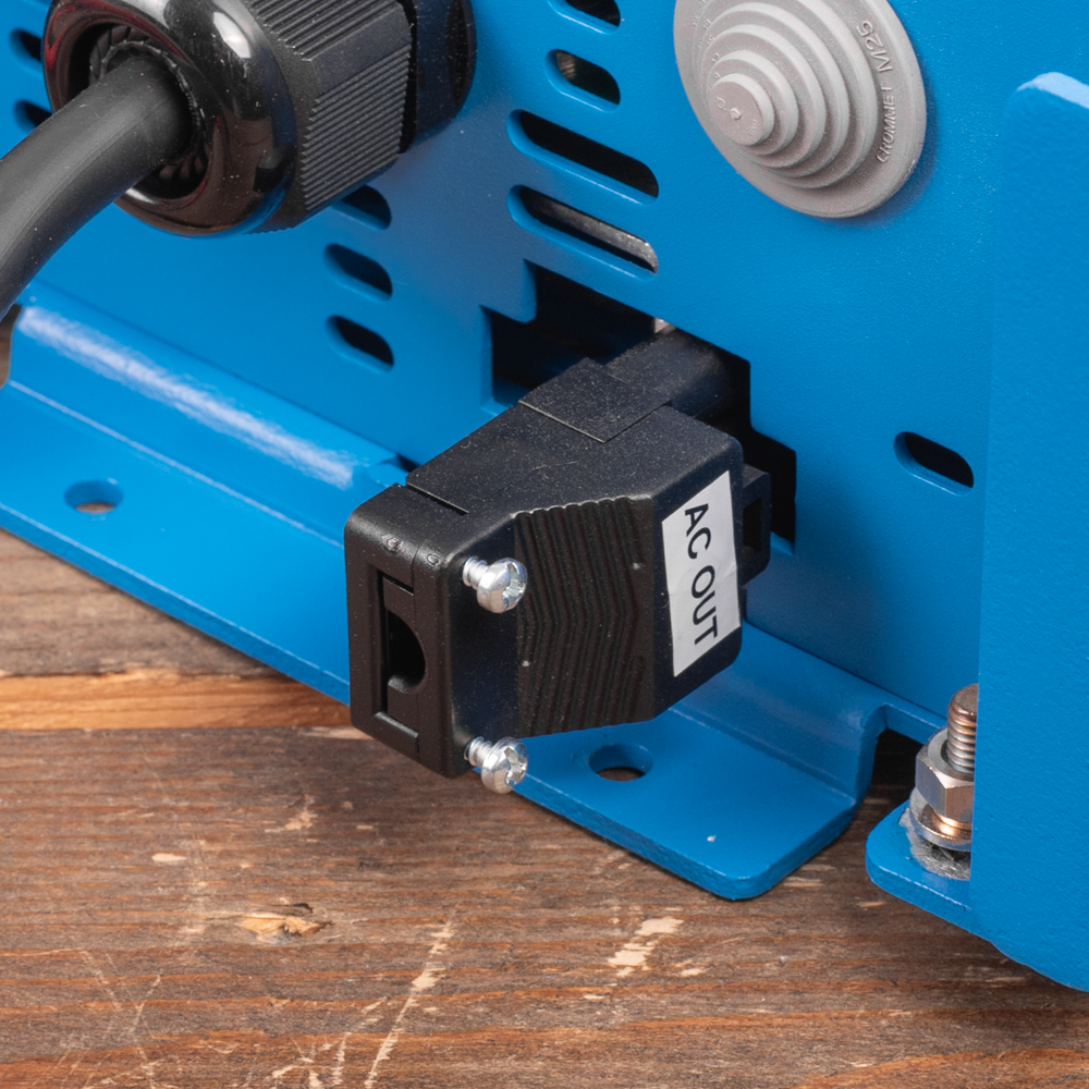 De Phoenix Compact 24/1600 heeft als output veerklemmen voor de 230V aansluiting. U kunt hierop direct uw AC snoer vastzetten. De accuaansluitingen zijn M8 bouten (bekabeling wordt niet meegeleverd).