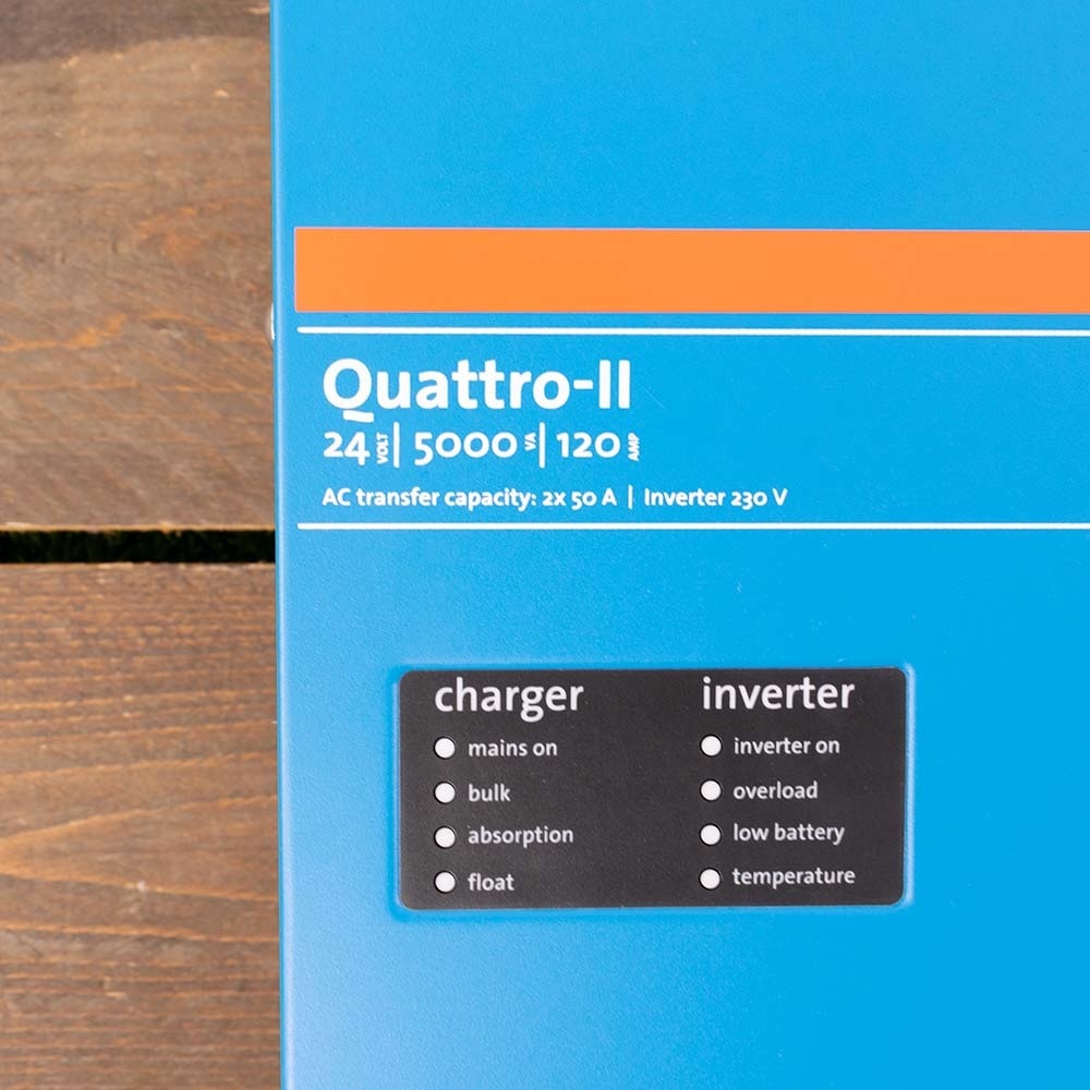 De Victron Quattro II 24/5000/120-50/50 230V is een combinatie van een krachtige DC/AC pure sinusomvormer, een geavanceerde krachtige acculader en een krachtige omschakelautomaat (2 x 50A), ondergebracht in een robuuste behuizing.