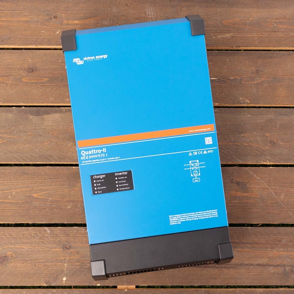 De Victron Quattro II 48/5000/70-50/50 is een combinatie van een krachtige DC/AC pure sinusomvormer, een geavanceerde krachtige acculader en een omschakelautomaat, ondergebracht in een robuuste behuizing.
