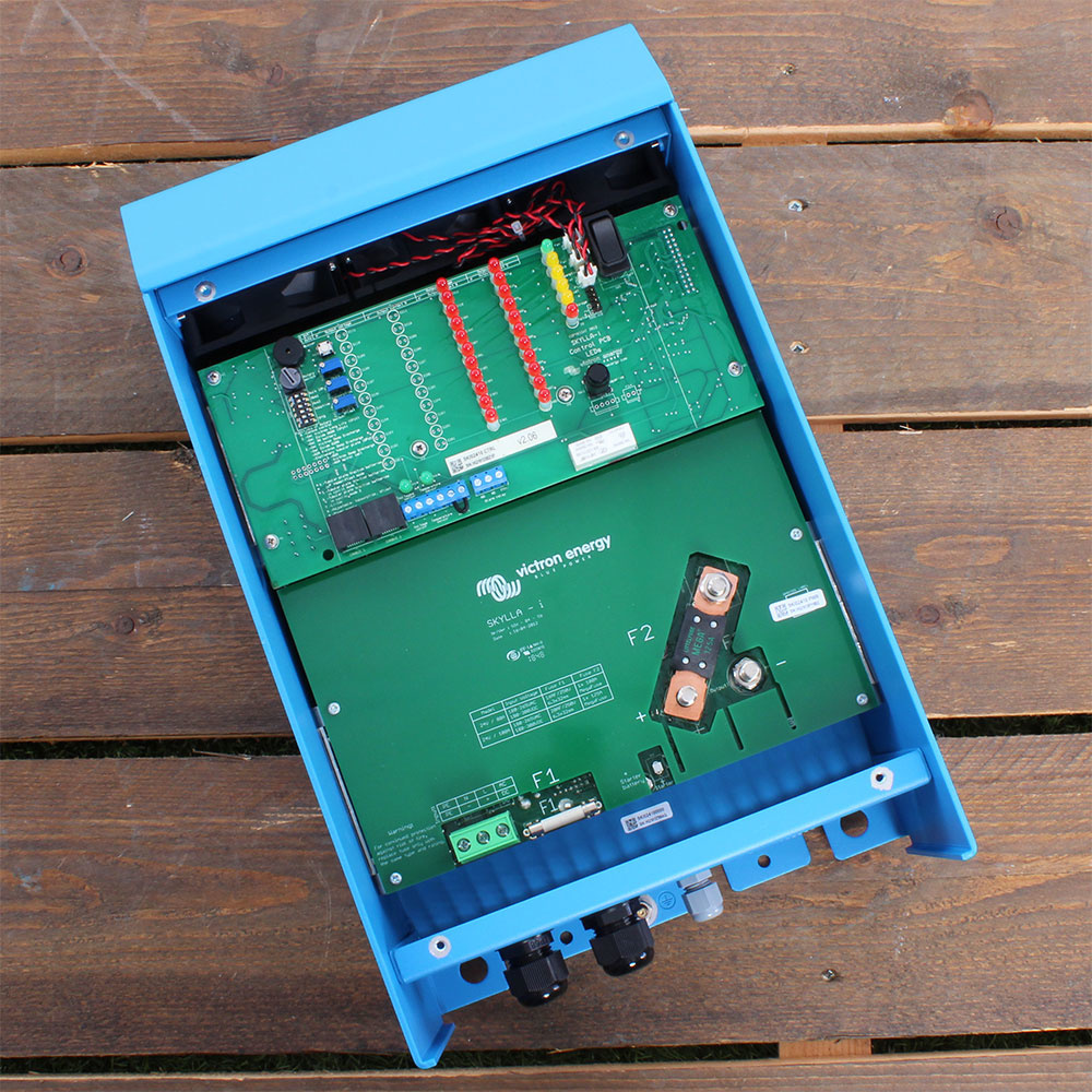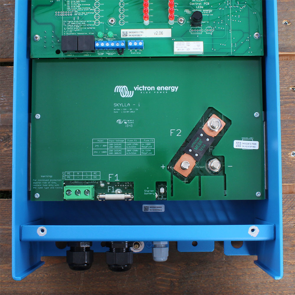 De Victron Skylla-i is de opvolger van de betrouwbare krachtige Victron Skylla-TG. De Skylla-i is iets lichter van gewicht, heeft een CAN-bus (NMEA2000) interface en is Li-Ion (LiFePo4) ready omdat een koppeling mogelijk is tussen het Li-ION BMS naar de afstandsbedieningspoort op de Skylla-i.
