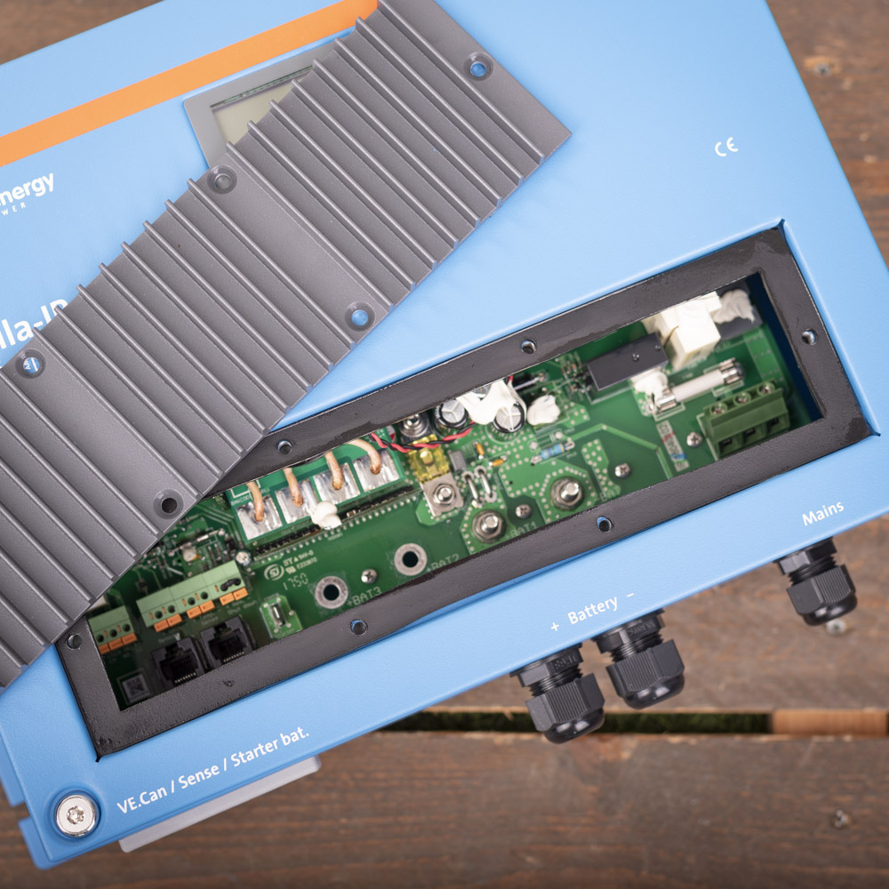 De Victron Skylla IP44 is een robuuste krachtige lader in een stalen epoxy-gepoedercoate behuizing. Deze is daarmee spatwaterbestendig en bestand tegen hitte, vocht, stof en zoute lucht. Deze lader bevat verder een multifunctioneel LCD display om de laadspanning en laadstroom in te stellen voor elk type open of gesloten loodzuur accu.