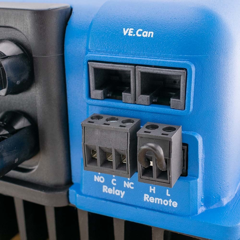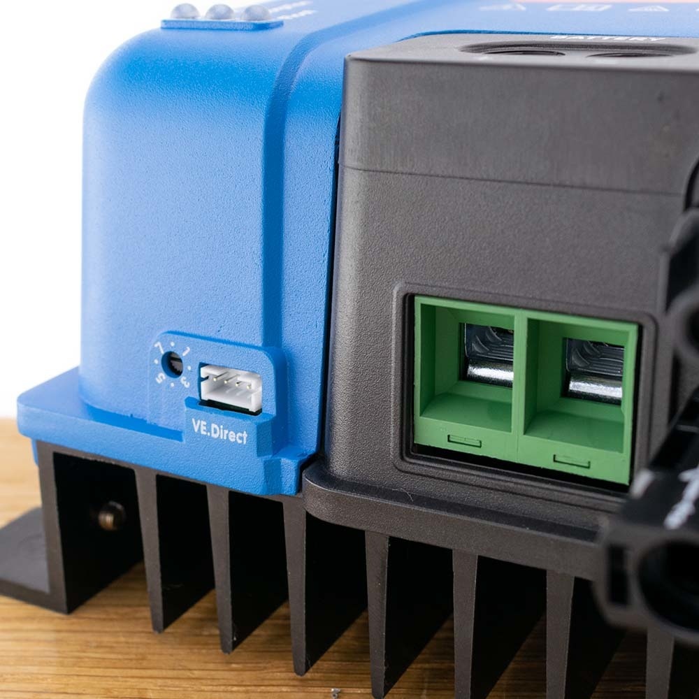 Deze MPPT laadregelaar is uitgerust met zowel VE.Direct als met VE.Can. Met VE.Can of Bluetooth kunnen tot 25 zonneladers in serie gezet worden, en verbonden worden met een Color Control GX of ander GX-toestel. Elke Regelaar kan individueel beheerd worden, bijvoorbeeld met een smartphone of iPad (Bluetooth) of met een Color Control GX (VE.Can) en dan eventueel ook op de VRM-website.