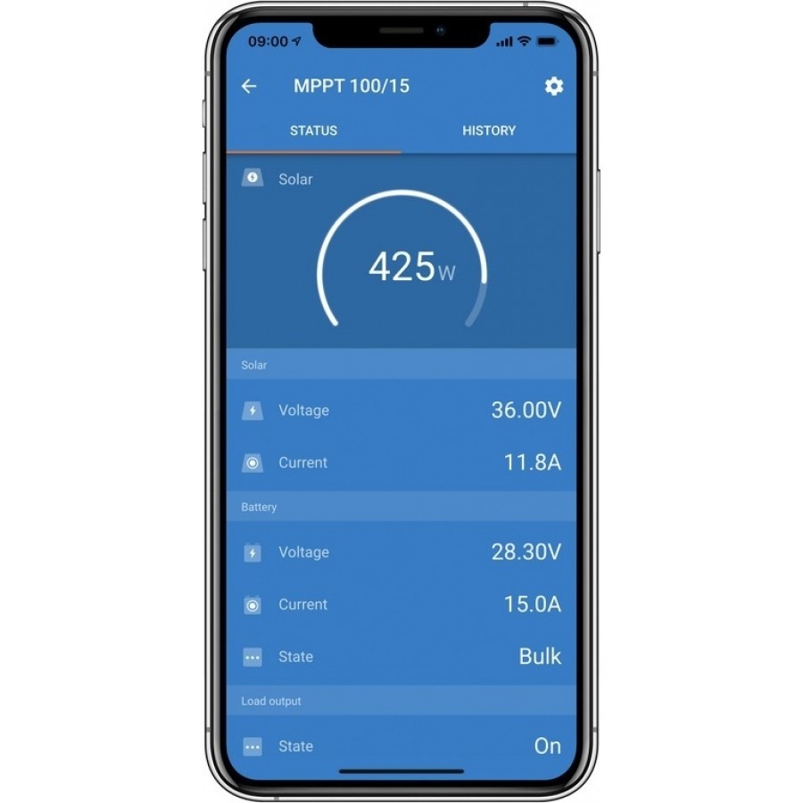 U kunt via Bluetooth met uw telefoon de laadregelaar instellen en beheren. Klik hier om de beschikbare apps en software te downloaden voor uw Victron Laadcontroller.