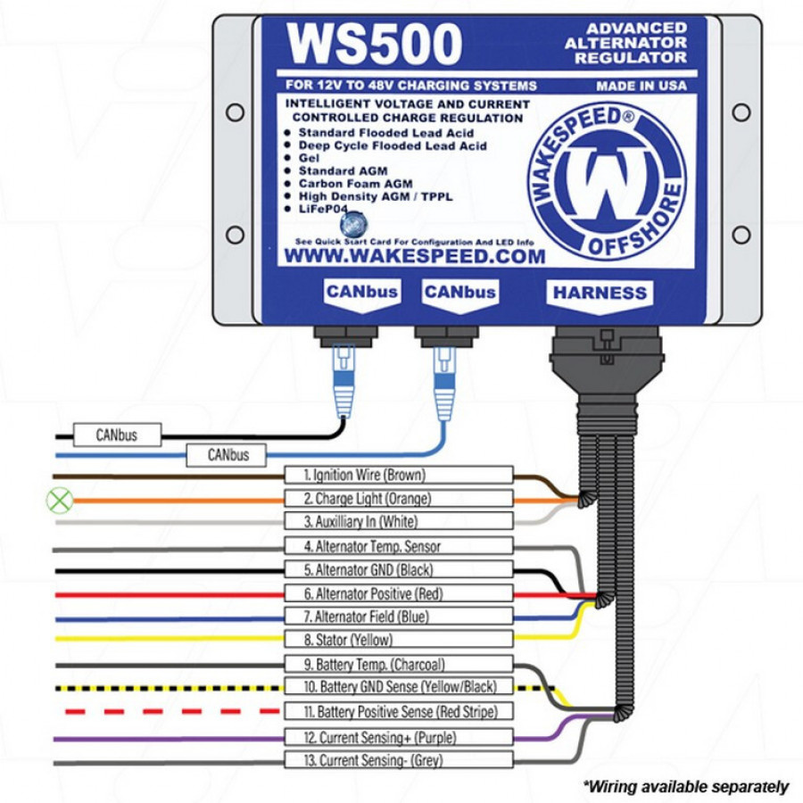 De kabelboom bepaalt de polariteit van de regelaar, dus het is essentieel om ervoor te zorgen dat de kabelboom overeenkomt met de veldexcitatiepolariteit van de dynamo die wordt bestuurd. Kabelbomen zijn voorzien van Superseal-connectoren voor de temperatuur van de dynamo en accutemperatuursensoren. De Dynamo temperatuursensor pigtail is inbegrepen. De gebruiker moet zorgen voor zekering voor positieve stroom- en positieve spanningsdetectiedraden. WS500 / PH (aangeduid met een rode band bij de Ampseal-connector) wordt weergegeven.
