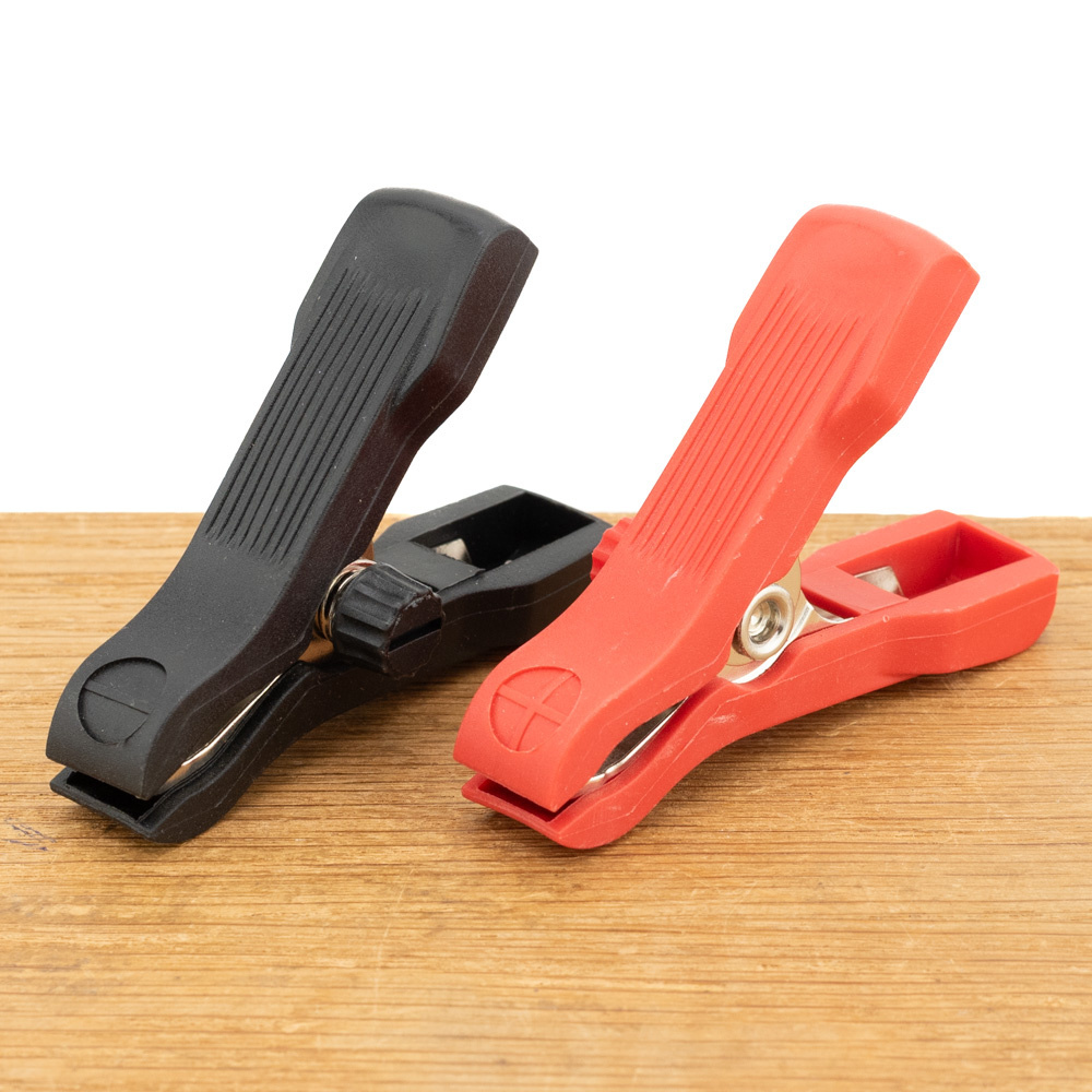 De aansluiting op de accu gebeurt met een 1 meter lange laadkabel met M6 ringogen of accuklemmen/ krokodillenbekklemmen. De accuklemmen kunnen gemakkelijk en snel gemonteerd worden op de ringogen.