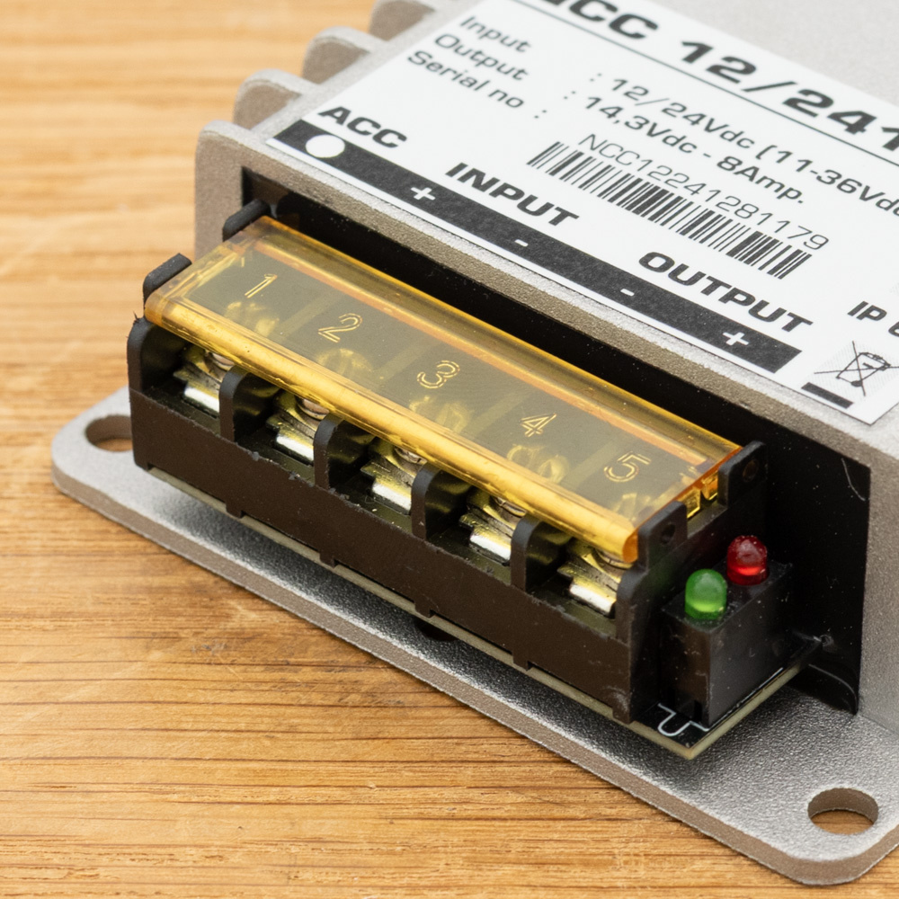 De uitgangsspanning is een vaste 14,3V in een 12V of 24V systeem met wisselende ingangsvoltages. De ingangsvoltages kunnen variëren van 11 tot 36V.