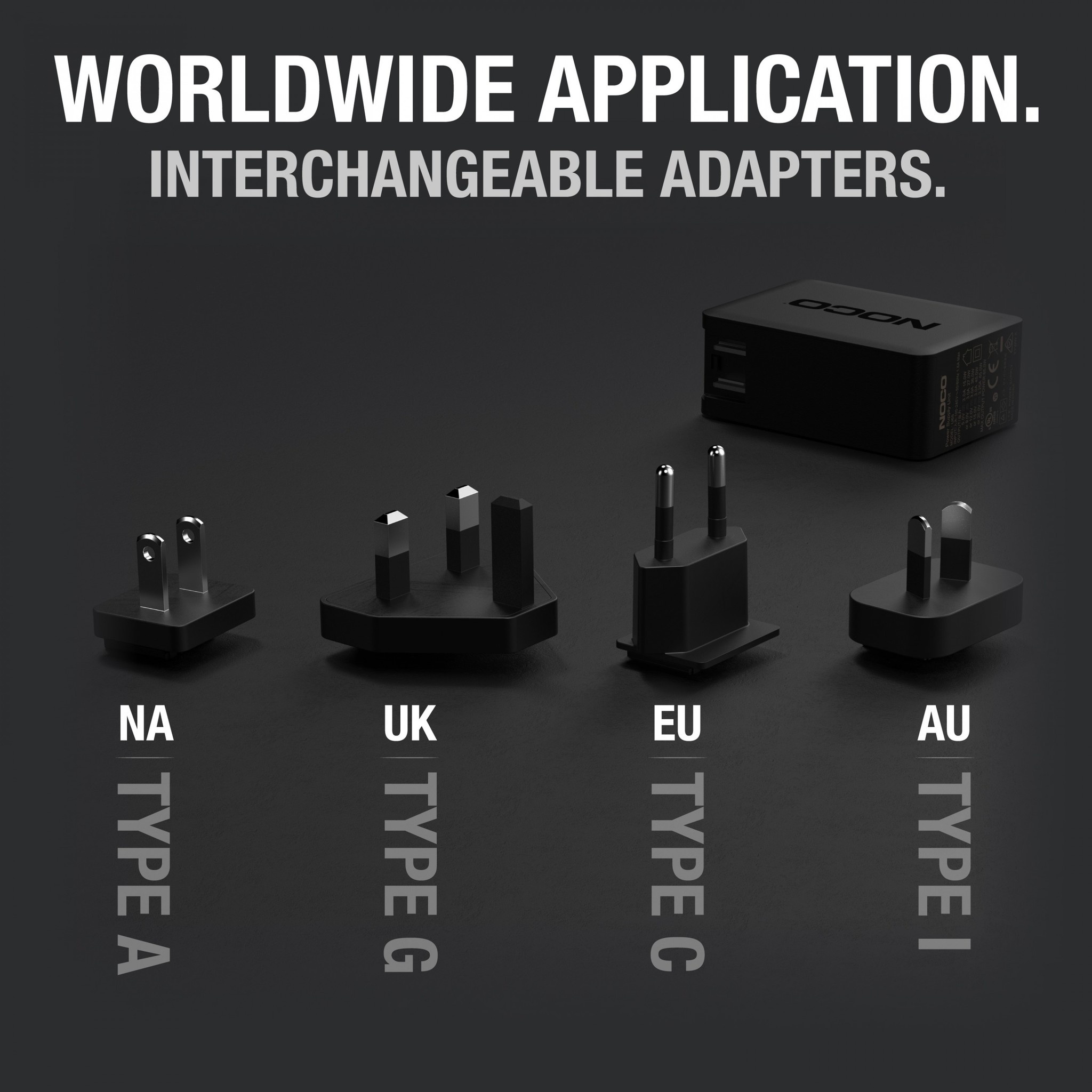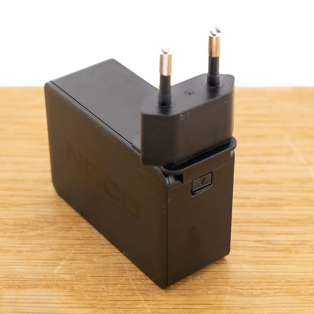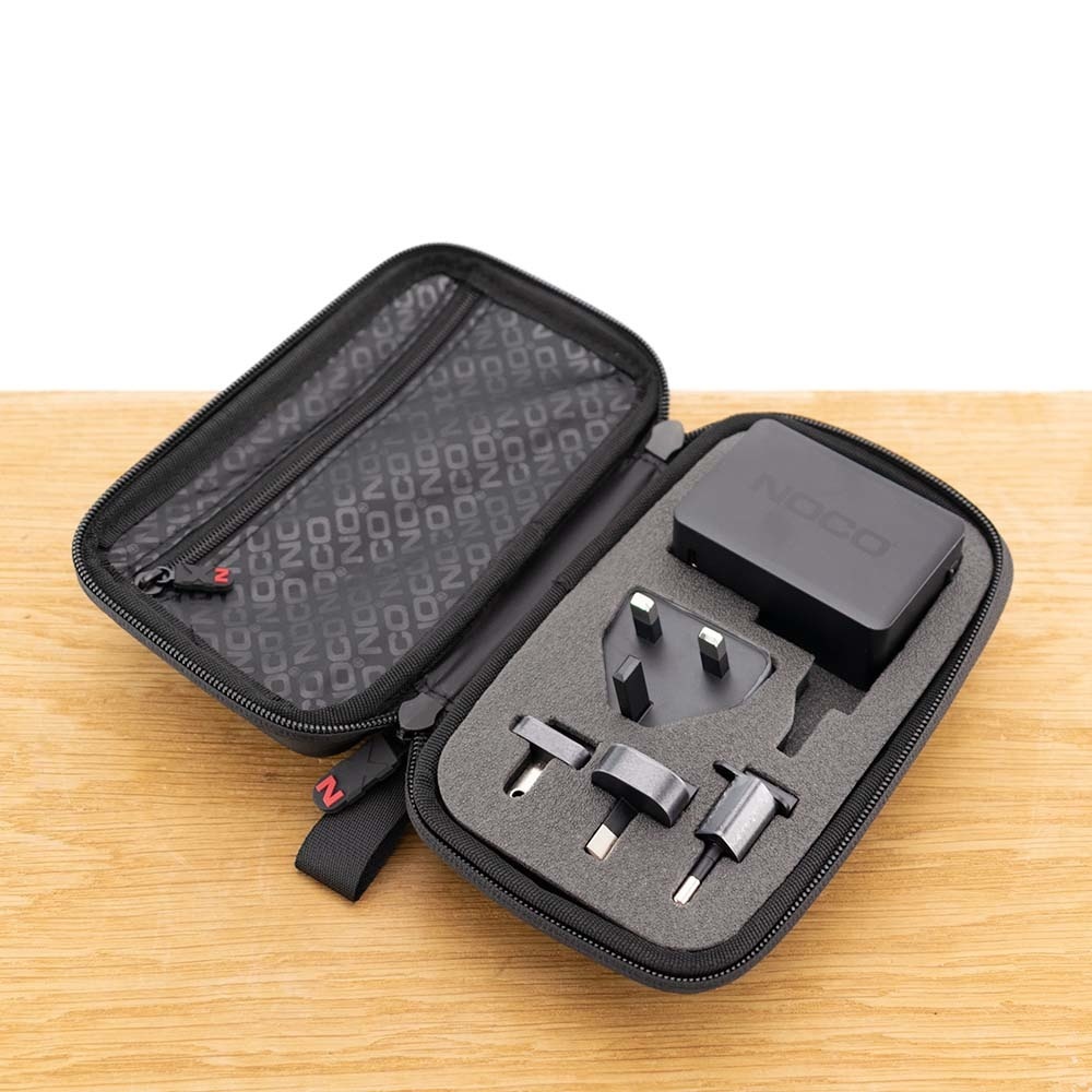 U kunt met deze adapter overal ter wereld uw jumpstarter van Noco Genius snel opladen. De input van de adapter is 100 tot 240V en bijgeleverd worden netsnoeren en stekkers voor Australië, Europa, Noord-Amerika en het Verenigd Koninkrijk.