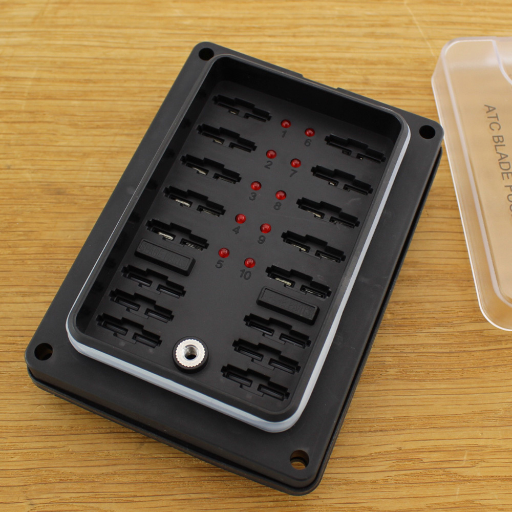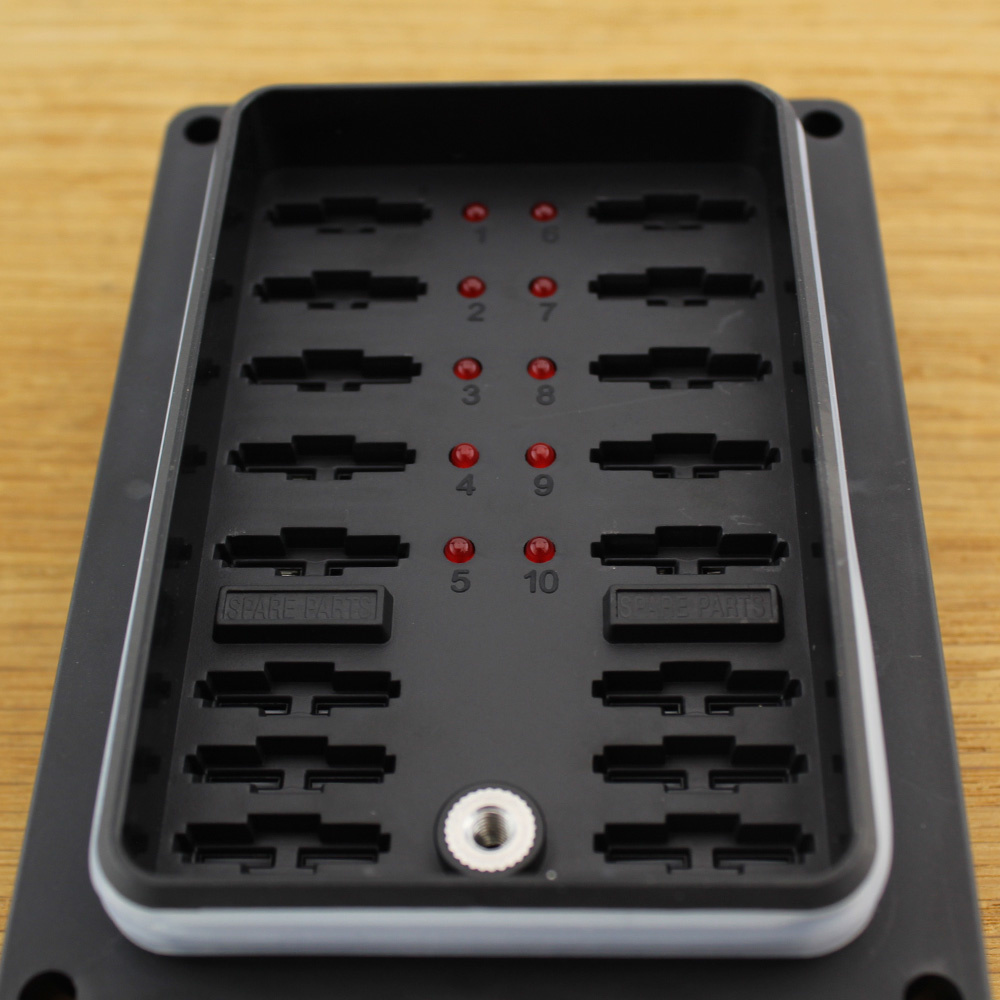 Deze zekering distributie voor 10 zekeringen met led signalering kan 10 steekzekeringen/ autozekeringen onderbrengen. De leds geven een doorgebrande/ defecte zekering aan. Door de transparantie afdekkap kunt u direct zien of er een zekering defect is. Deze houder is gemaakt voor steekzekeringen van 30A maximaal. De houder bevat ook 6 posities voor reservezekeringen.