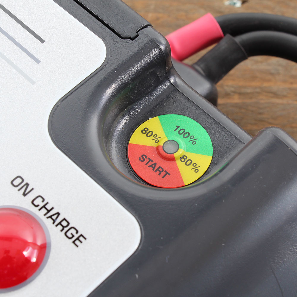 De voortgang van het laadproces wordt inzichtelijk gemaakt met een led op de lader die rood (accu is onder de 80% vulling), geel (accu is ongeveer voor 80% geladen) of groen (accu is volledig geladen en klaar voor gebruik).